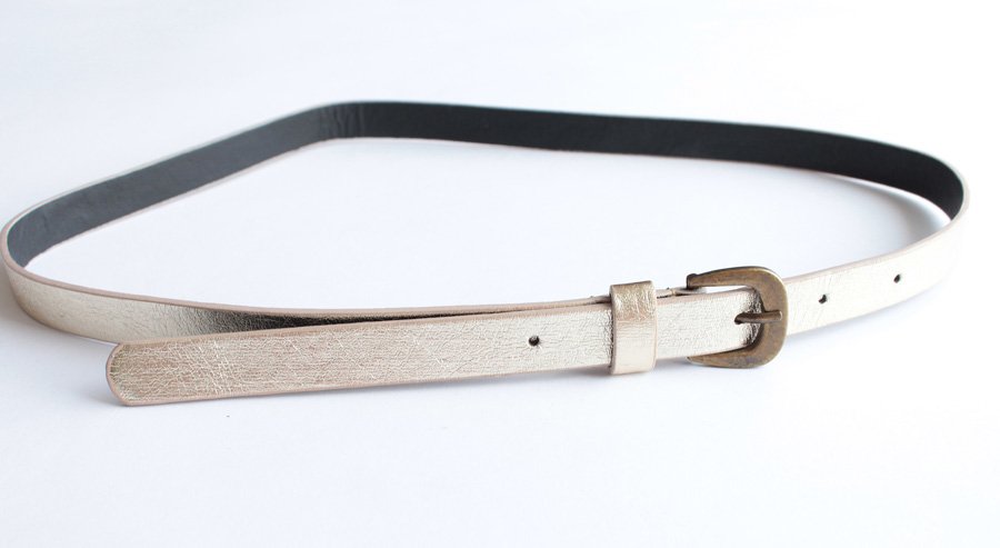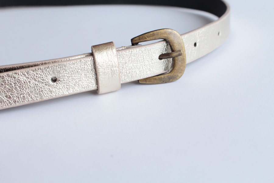 Złocisty pasek o subtelnym połysku wykonany prawdopodobnie z ekoskóry.