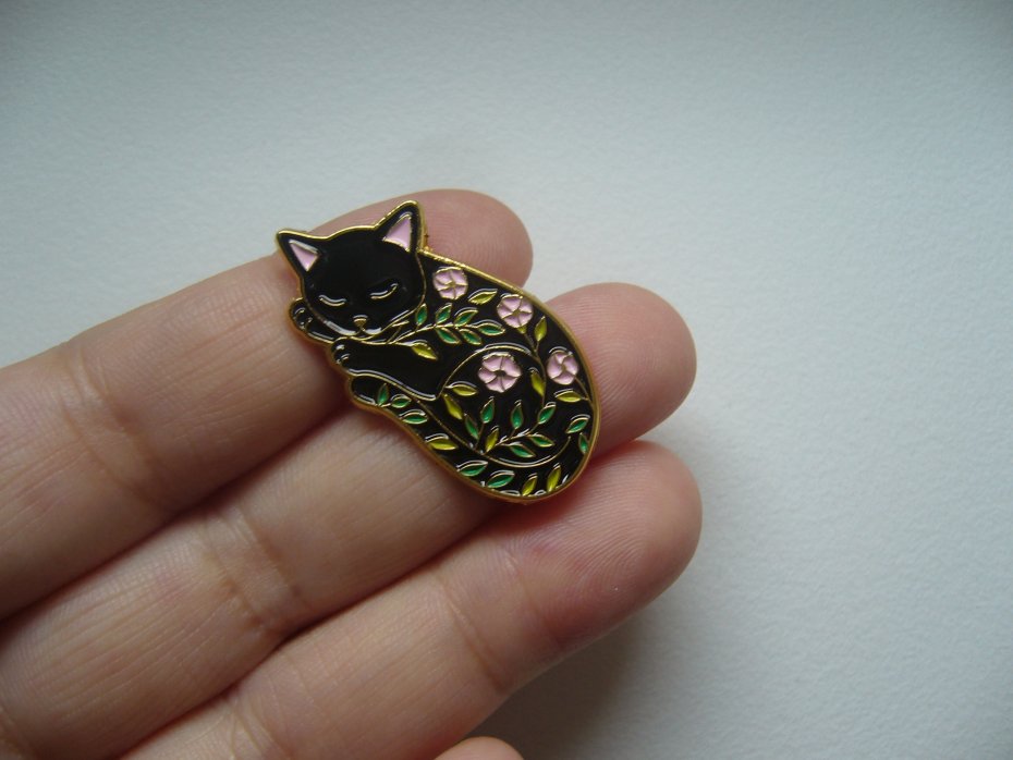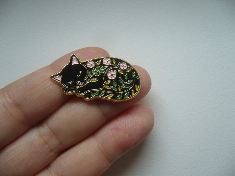 METALOWA EMALIOWANA PIN PRZYPINKA BROSZKA CZARNY KOT KOTEK KWIATY