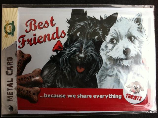 Nowa, nie odpakowana, zabawnie przyjacielsko-psia pocztówka w postaci małej metalowej reklamy - gotowa do nadania na poczcie. Błyszczące szkliwienie, jakość nadruku. 15,5 x 10,2 cm. Stan zachowania bardzo dobry.