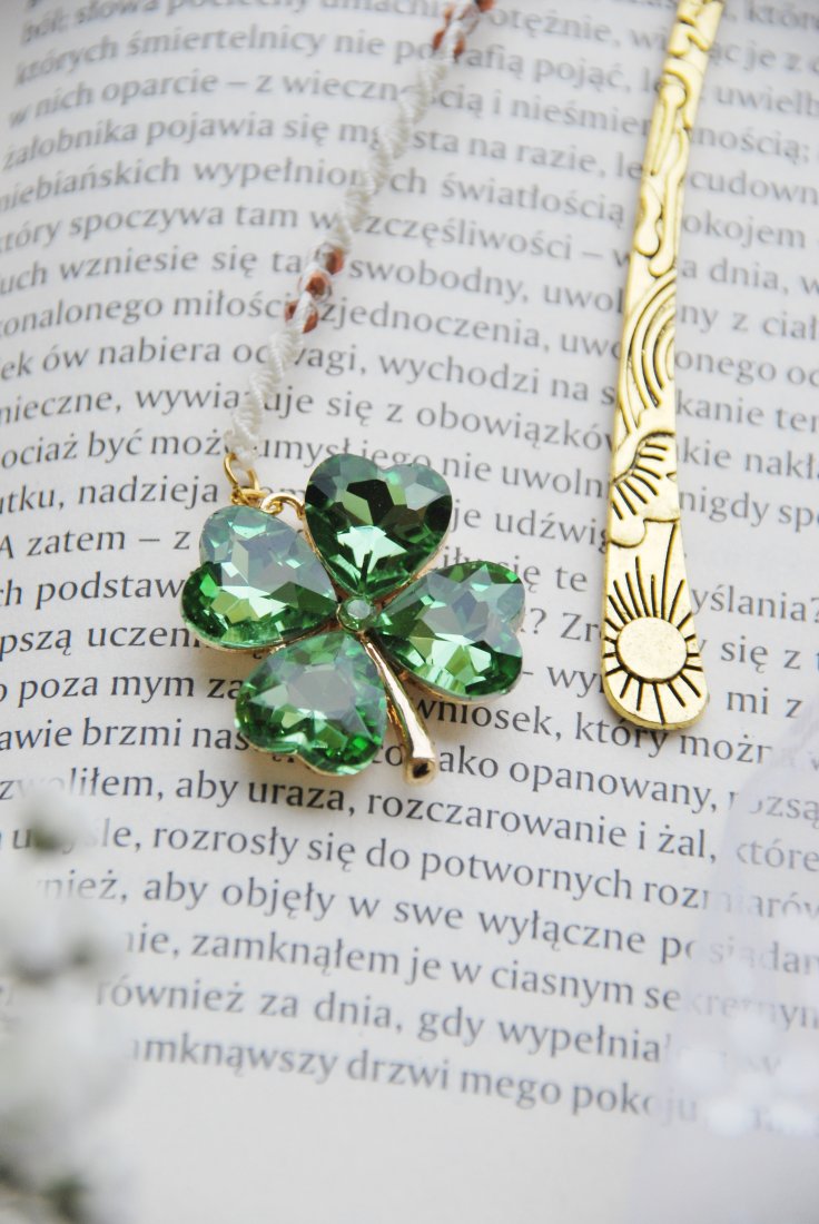 Ta zakładka do książki nie jest zwyczajnym przedmiotem — to mały talizman nadziei i szczęścia. Baza z metalu o delikatnym, ale trwałym wykończeniu, ozdobiona została czterolistną koniczynką o głębokim, szmaragdowym połysku. Każdy liść zdaje się łapać światło, jakby szeptał ciche życzenie dla czytelnika — "zatrzymaj się, oddychaj, pozwól sobie marzyć".