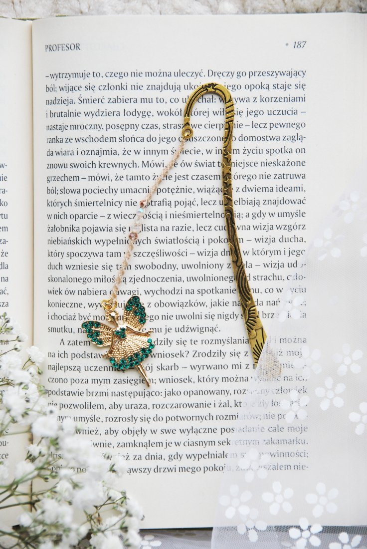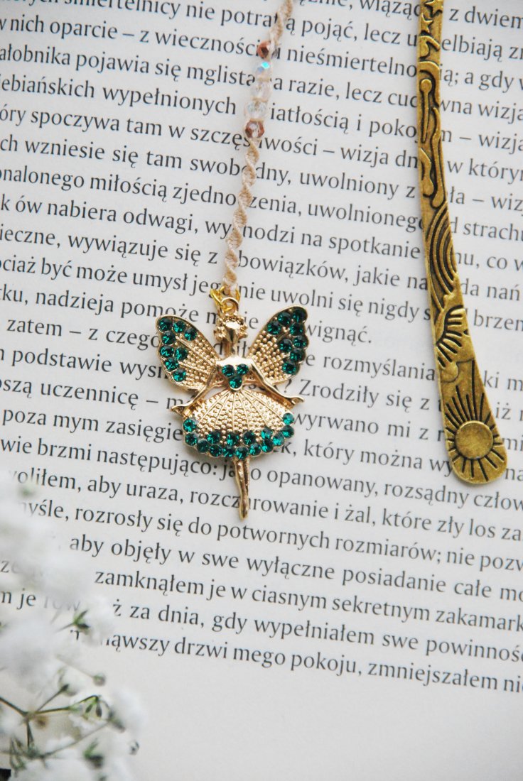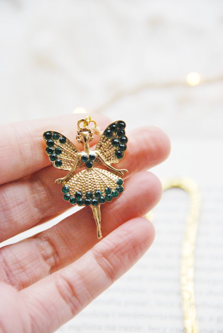 Zakładka wykonana z metalu w złotym kolorze z finezyjnym grawerunkiem, zakończona uroczą wróżką ozdobioną zielonymi kryształkami. Jest trwała, odporna na zginanie i uszkodzenia – idealna do codziennego użytku.