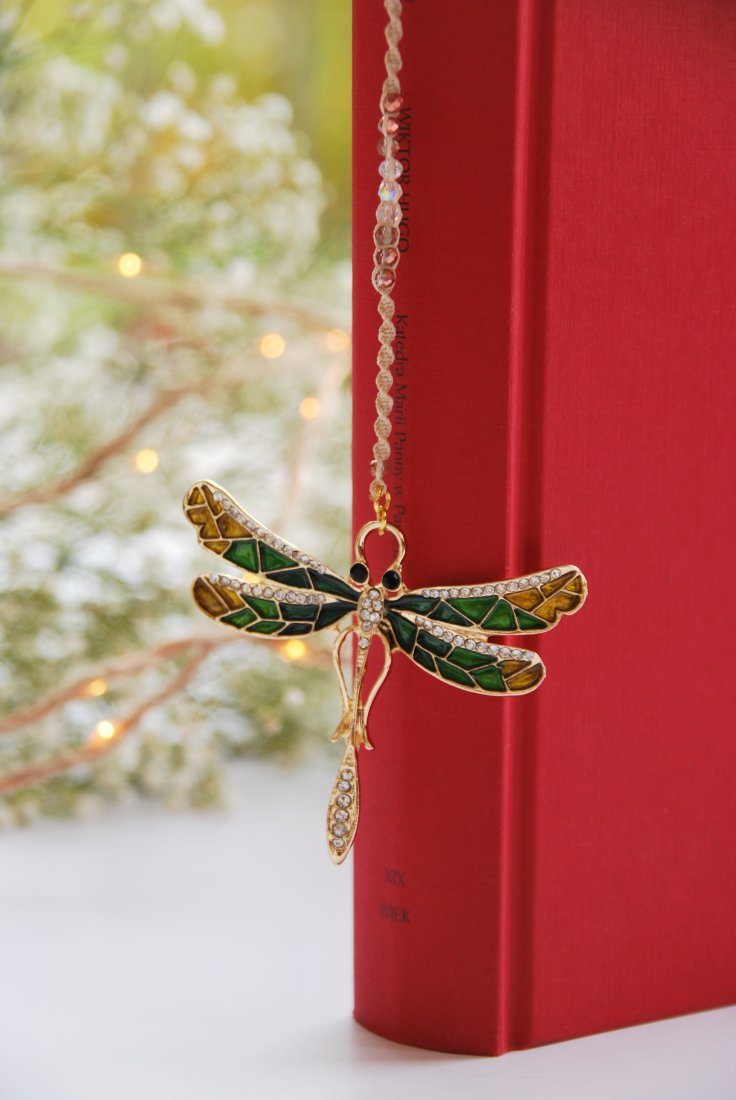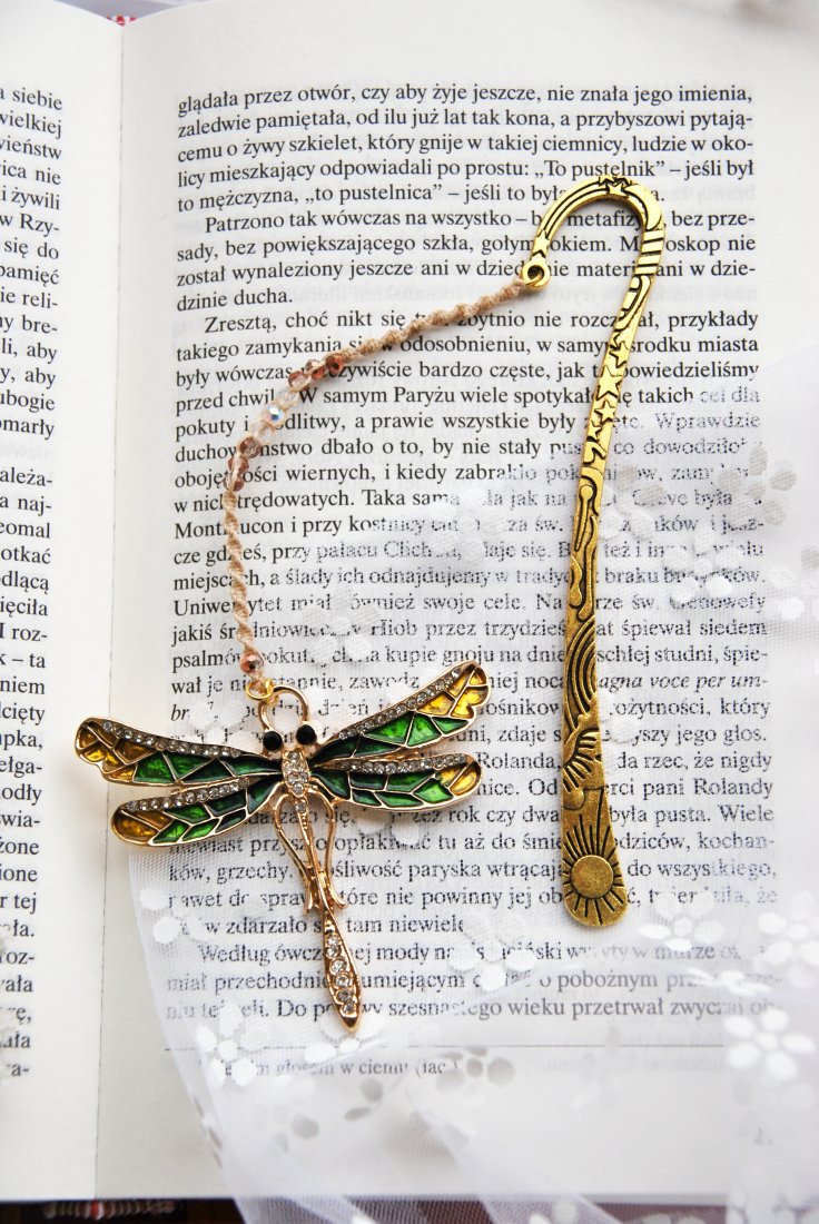 Zakładka została wykonana z metalowej bazy z misternymi zdobieniami i artystycznym wisiorkiem w kształcie ważki o skrzydłach w odcieniach zieleni i złota. Każdy detal zachwyca precyzją, tworząc połączenie elegancji i duchowej symboliki.