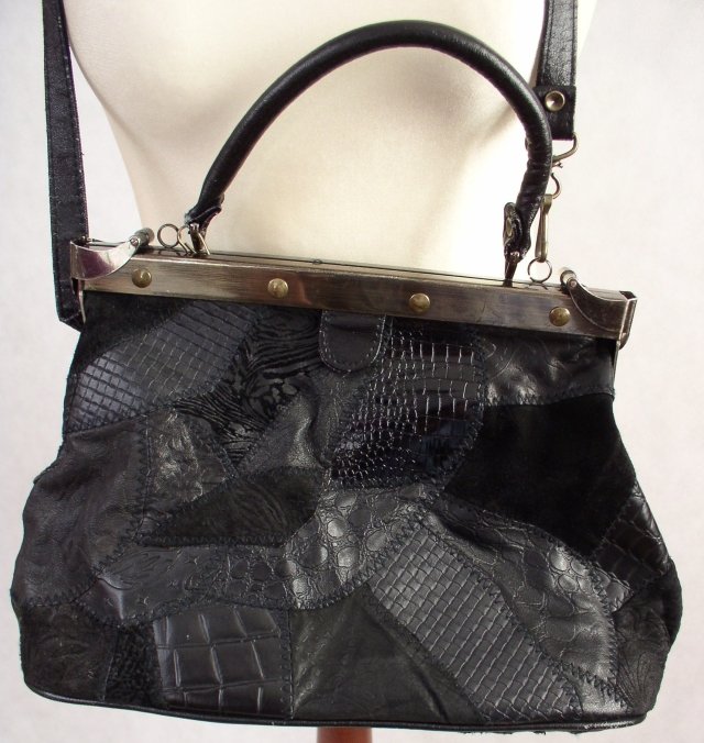 Torebka szyta z kawałków skóry naturalnej z różnym wzorem + skóra ekologiczna..U góry metalowe wzmocnienie + boczne zapięcie podnoszone do góry.Krótka rączka do noszenia w ręku + długi pasek,zapinany na karabińczyki.Podszewka czarna ,bawełniana.W środku jedna komora + kieszonka na zamek.Stan ogólny dobry+ krótka rączka przy zapięciu lekko wytarta.Wyskość 21 cm.szerokość 35 cm.dno 31 cm. x 14 cm.pasek dł.115 cm.