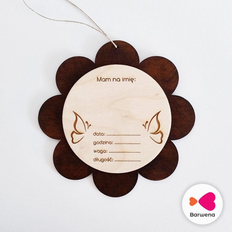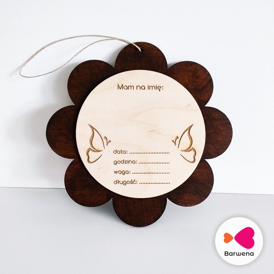 Drewniana dekoracja ze sklejki metryczka Kwiatuszek - wyjątkowa pamiątka dla niemowlaka.