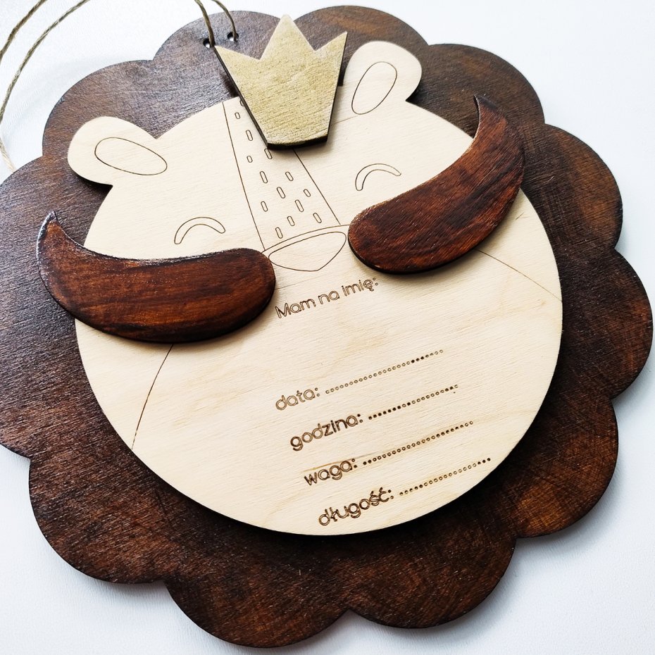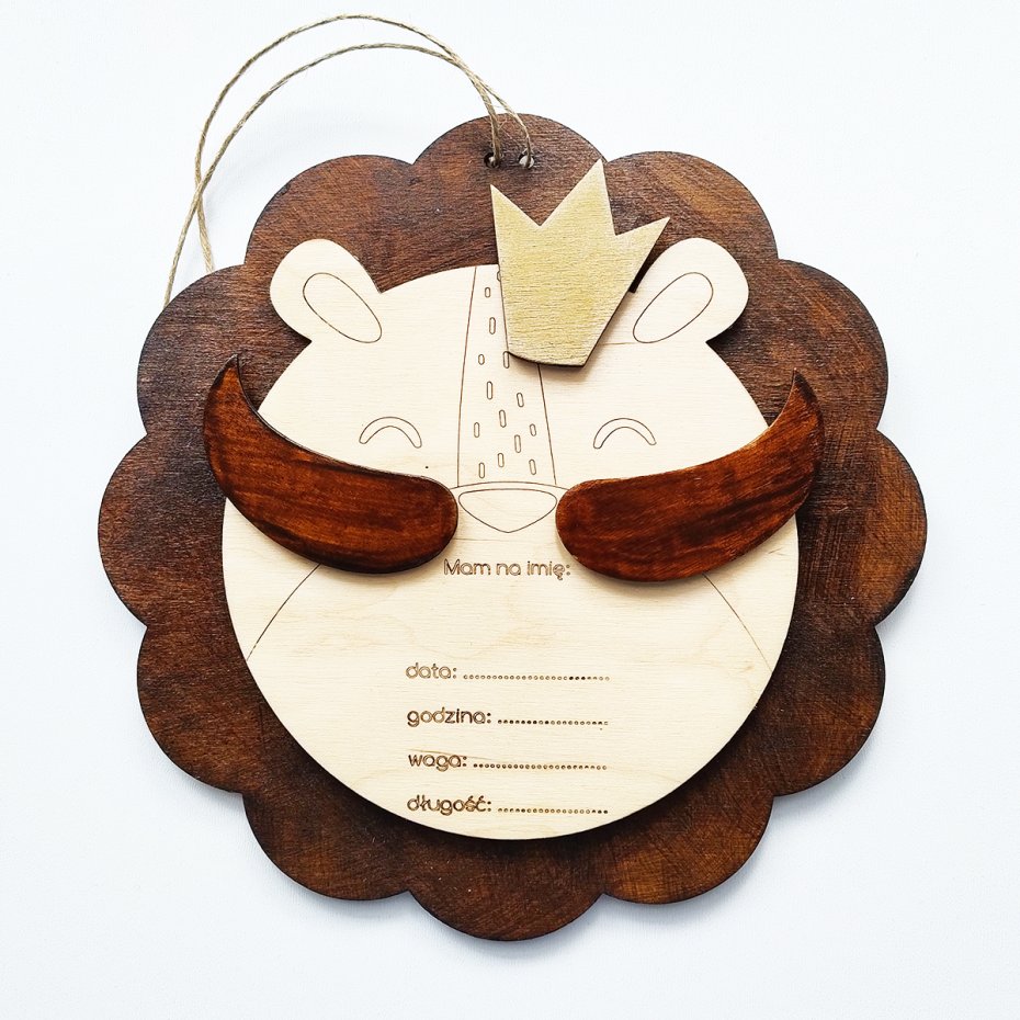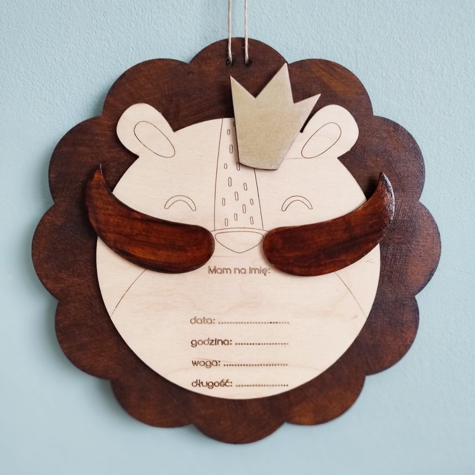 Drewniana dekoracja ze sklejki metryczka Lew - wyjątkowa pamiątka dla dziecka.