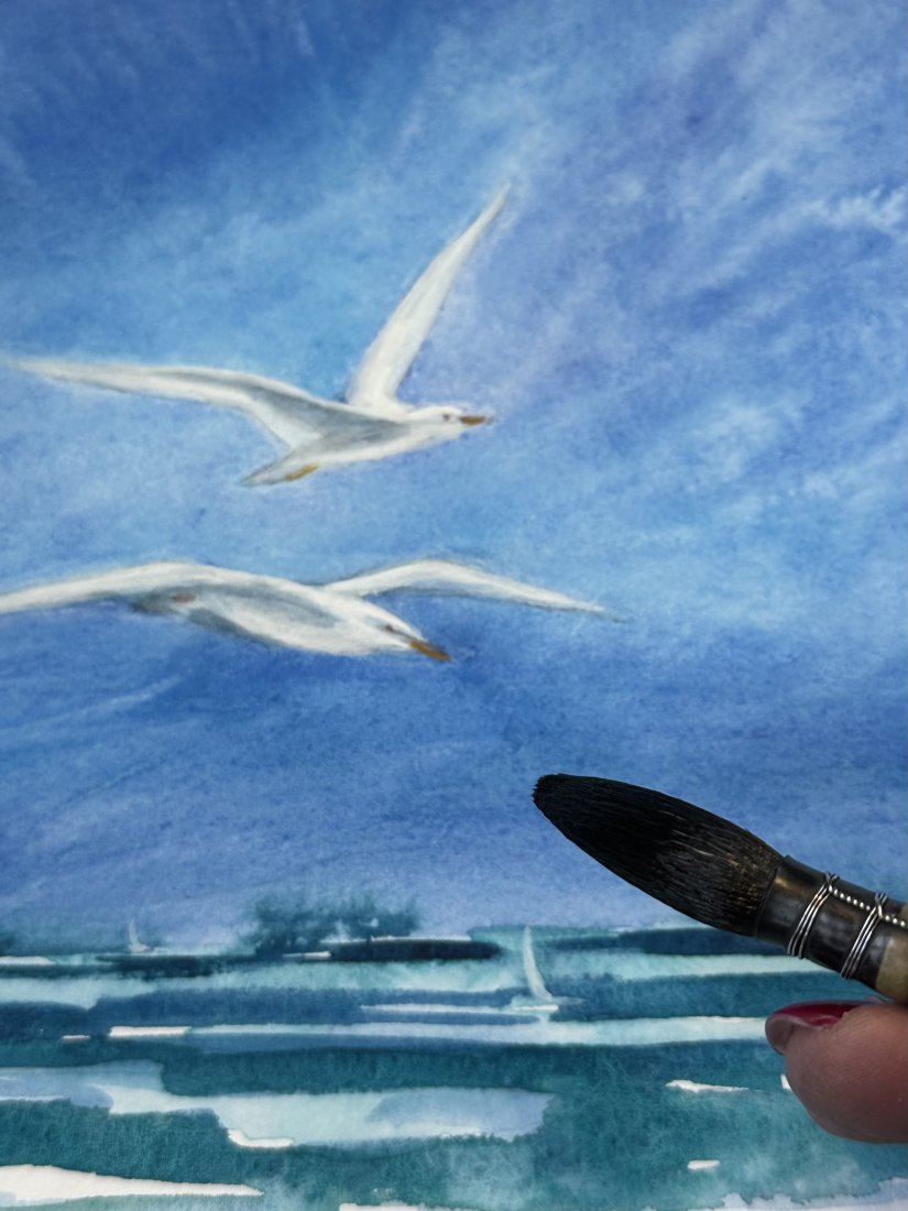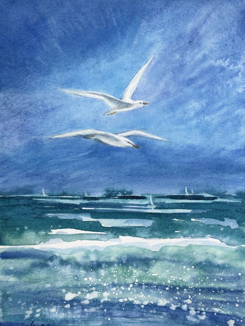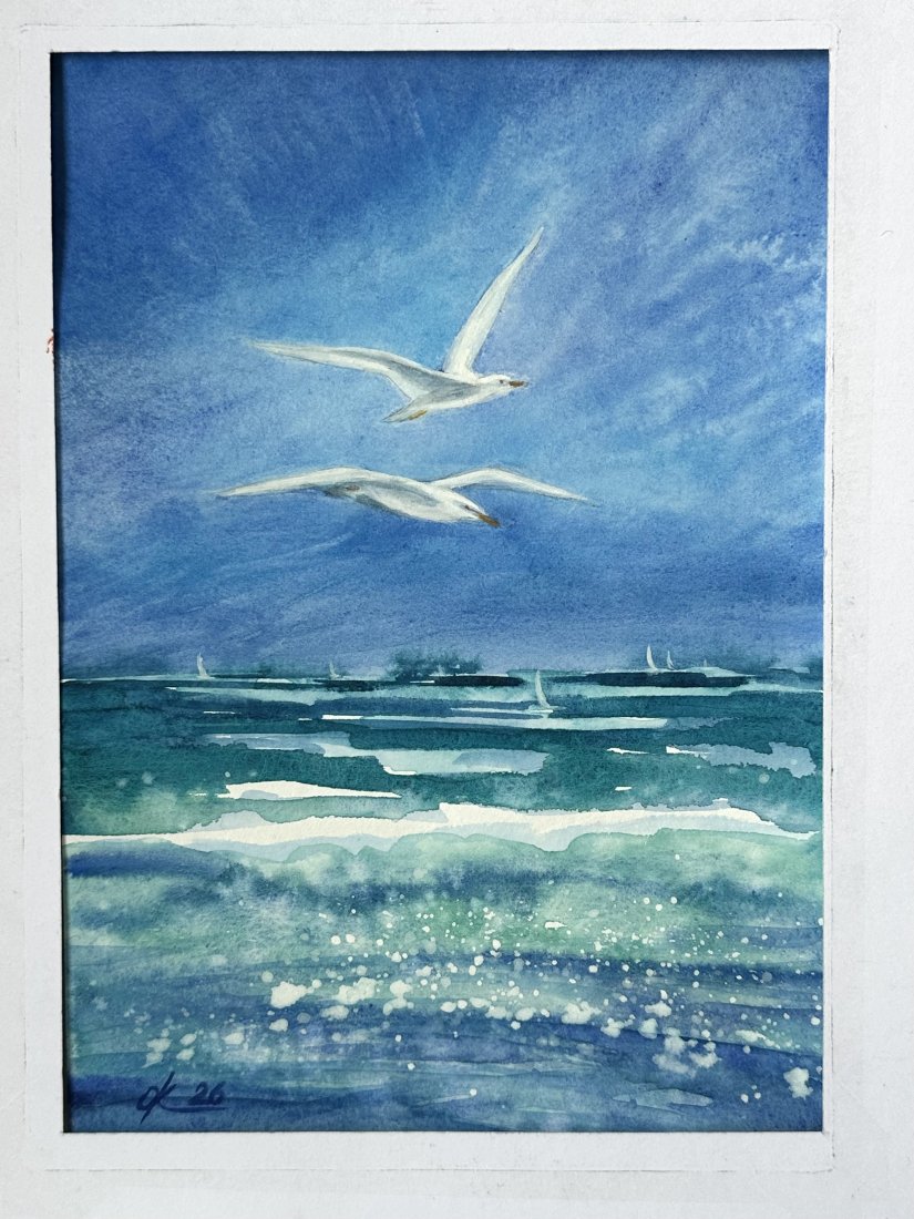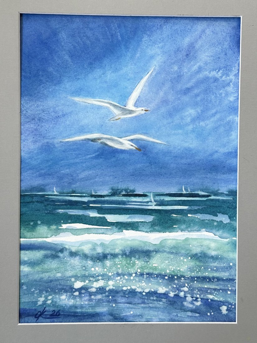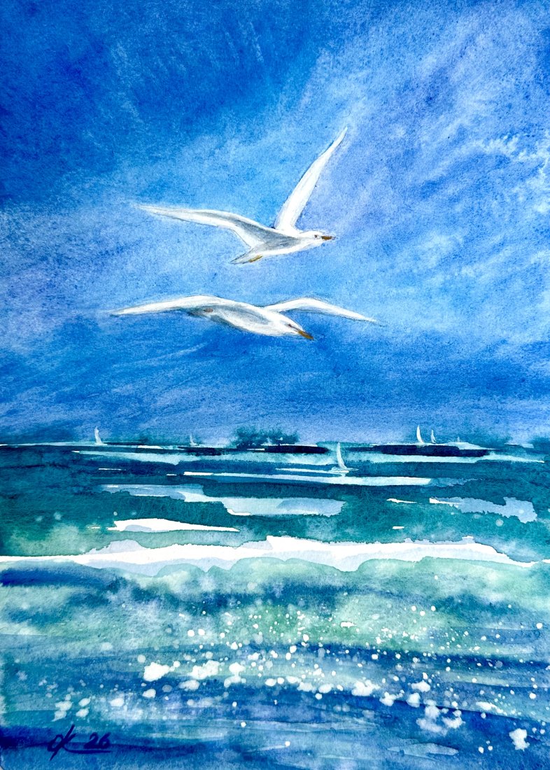 Tagi: #akwarelowy krajobraz, #mewy i burza, #ocean i mewy, #wybrzeże morskie