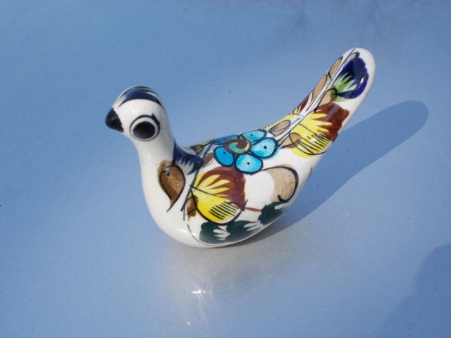 Ceramiczna, ręcznie malowana figurka, na błyszcząco szkliwiona. Kolory żywe, ciekawie ze sobą złożone. Rękodzieło meksykańskie chyba :) Sygnatura ręką autora czyniona WENED. Do ozdoby, do kolekcji i na prezent ;)