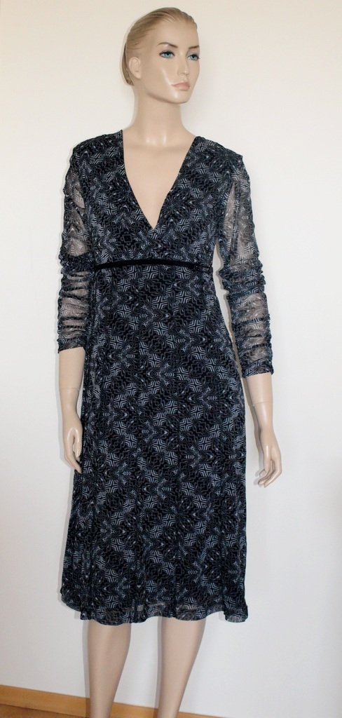 bardzo kobieca sukienka marki mexx. odcinana pod biustem i ozdobiona klamerką, dół z rozszerzających się klinów. rękaw transparentny, na dole drapowany. Materiał 100% nylonowa wzorzysta siateczka, pod spodem podszewka. Stan bardzo dobry, prawdopodobnie nieużywana. Rozmiar prawdopodobnie XL, ale mniejsza. na manekinie o rozmiarze 38. Podaję wymiary mierzone na płasko;