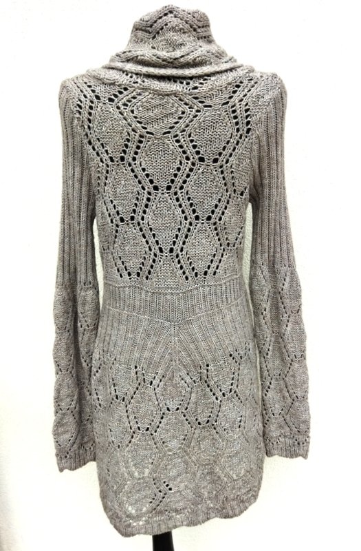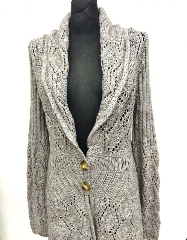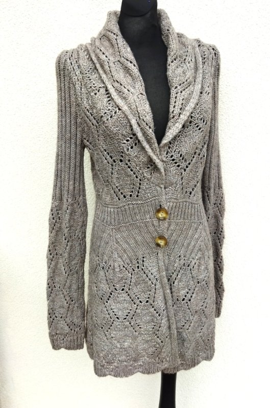 Dłuższy sweter w szarym kolorze, z ażurowym wzorem. Z dekoltem w szpic, z szalowym kołnierzem, talia podkreślona ściągaczowym wzorem, dół trapezowy. zapinany w pasie na dwa guziki. Miły podatny i rozciągliwy.
