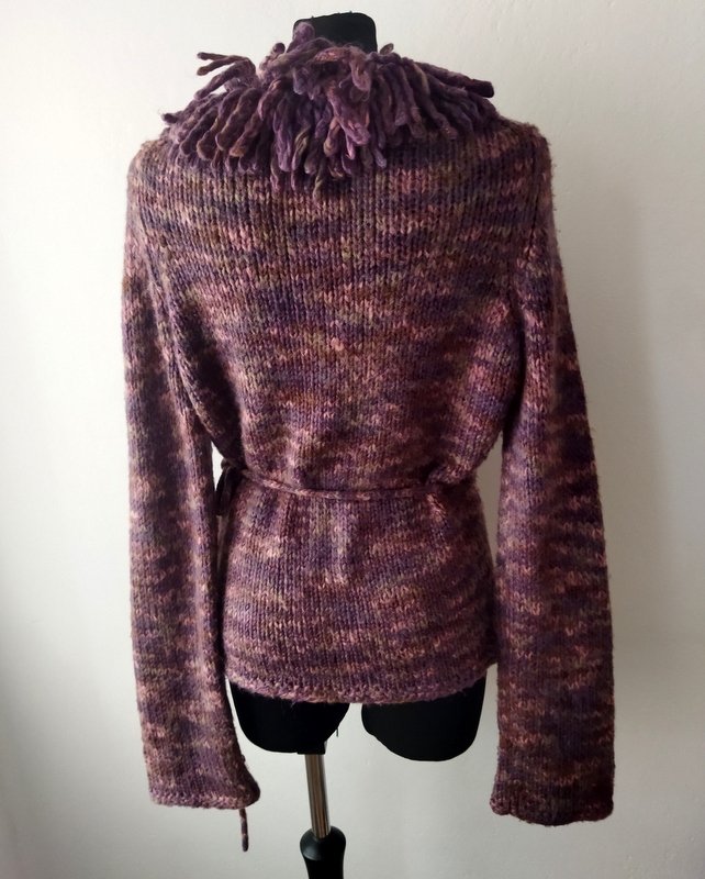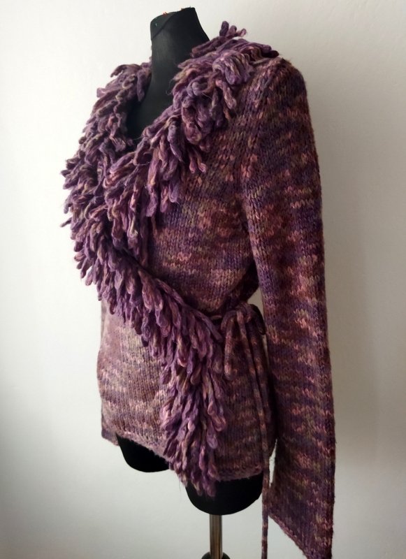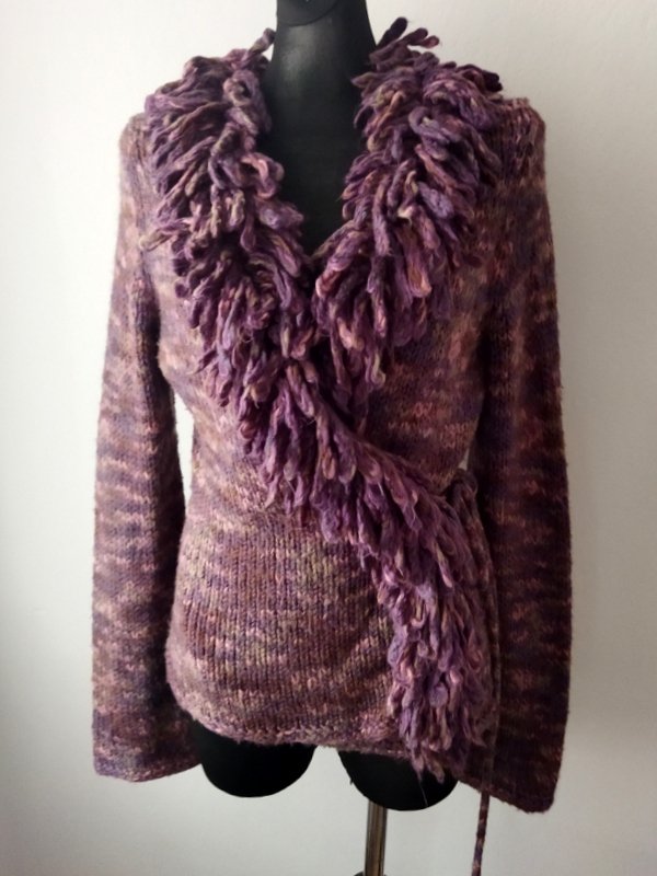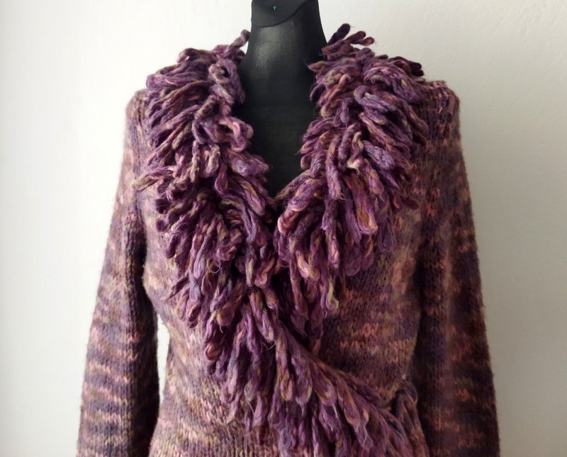 Ciepły sweter z grubej ale miękkiej akrylowo-wełnianej włóczki w melanżowej kolorystyce fioletu, szałwiowej zieleni, brązu i różu . z fantazyjnym Zakładany kopertowo z dekoltem w szpic wykończonym fantazyjnymi pętelkowymi i frędzlami, wiązany troczkami z jednego boku.