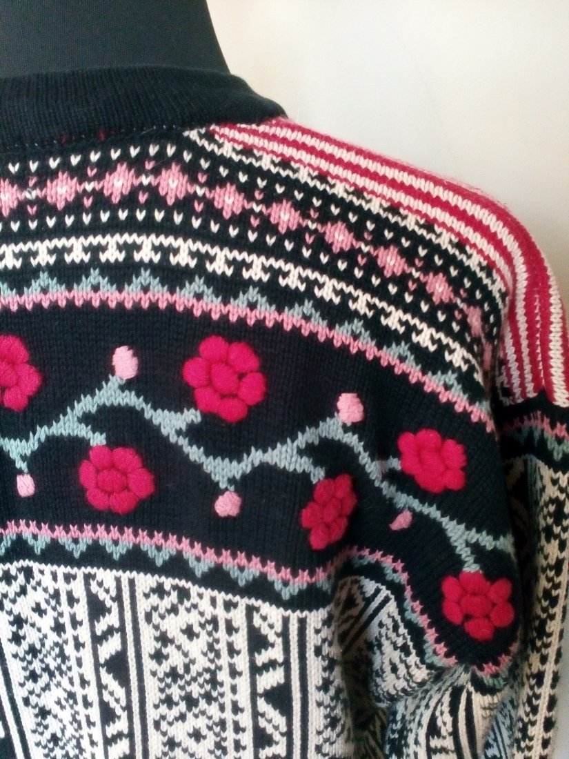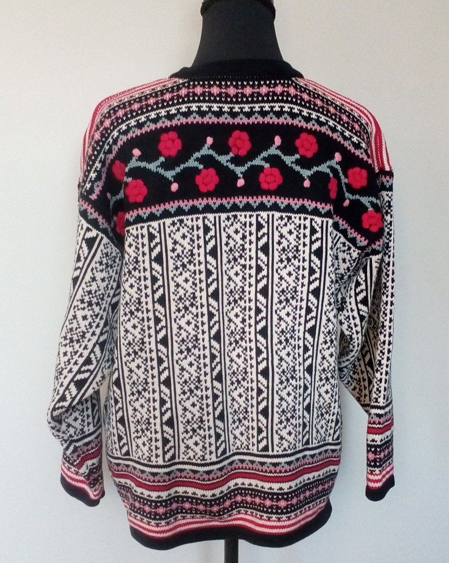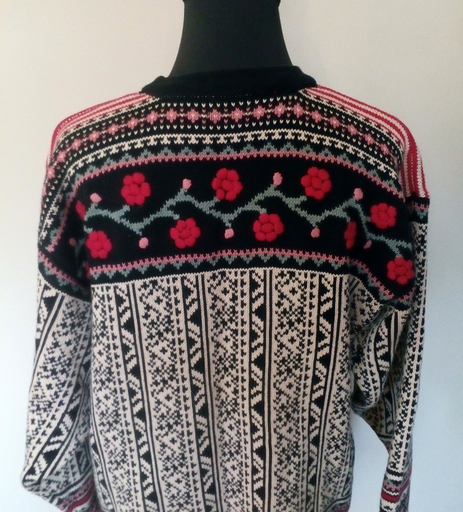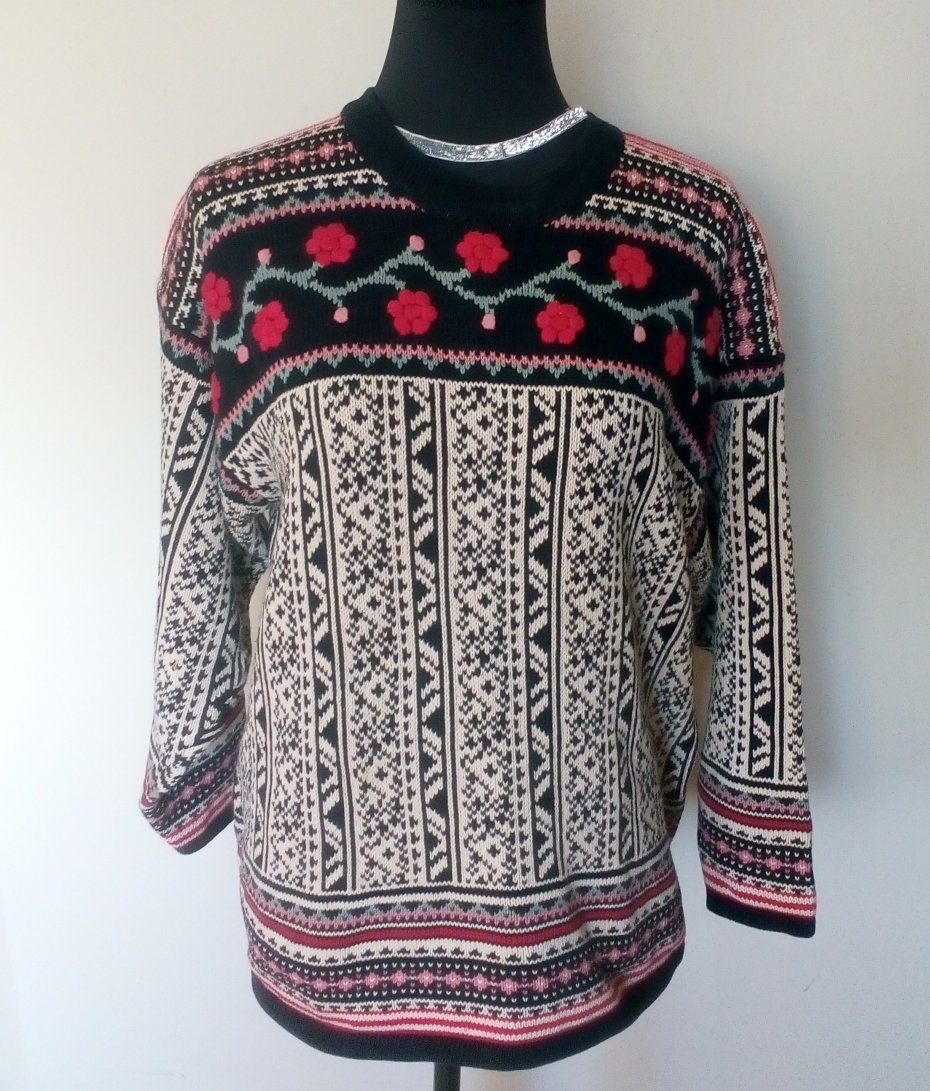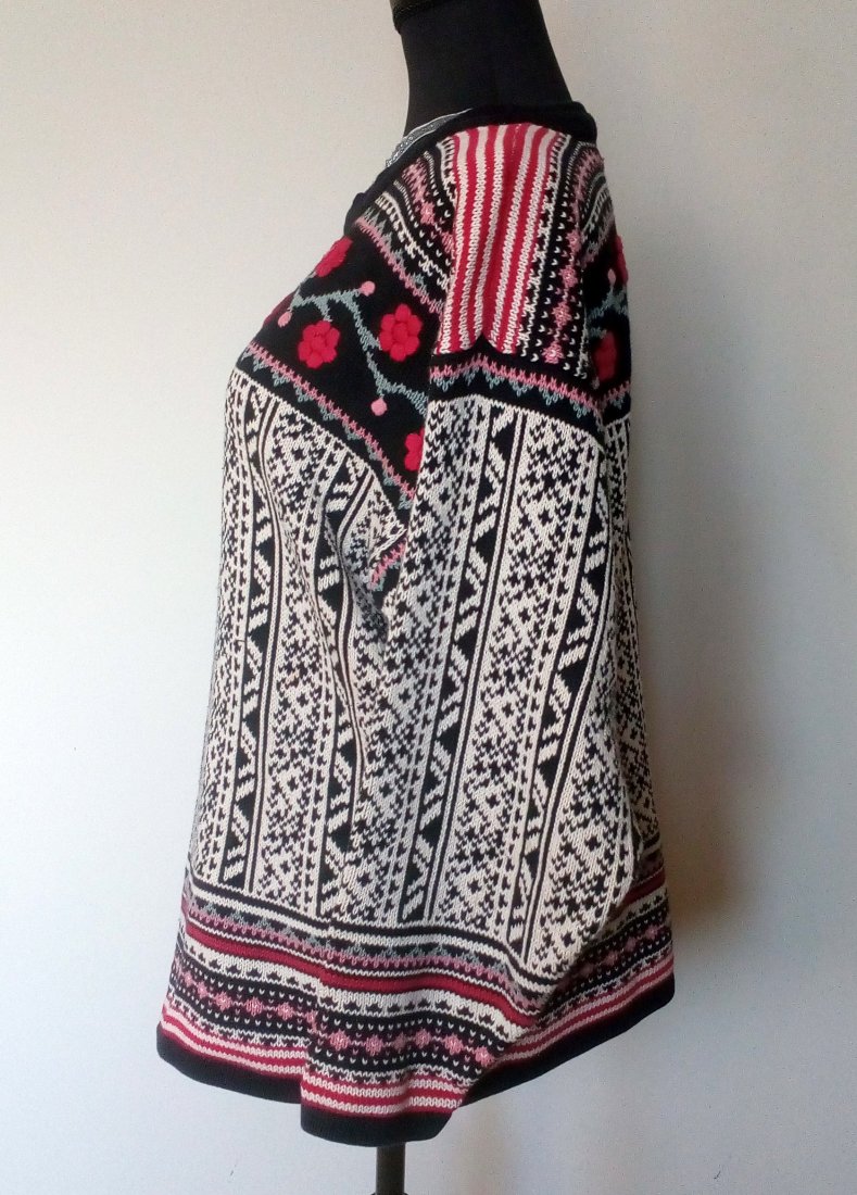 Wzorzysty, bawełniany sweter z haftowanymi kwiatami u góry przodu i na plecach, kolorystyka - czarny, beż, czerwony, mięta, pudrowy róż, rękaw obniżany