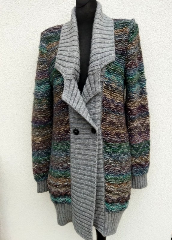Wspaniały sweter z grubszej ale miękkiej włóczki w kolorach szarości, kilku odcieni zieleni, beżów, brązów i granatu z ciekawym przestrzennym wzorem. Dwurzędowy z kołnierzem z rewersami, zapinany na dwa guziki Wykończony szarymi ściągaczami
