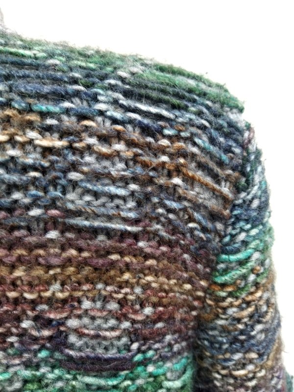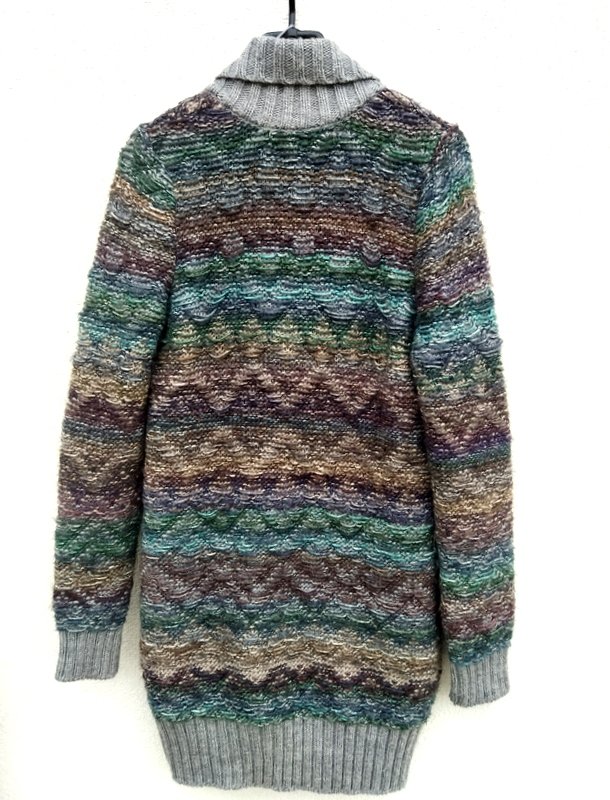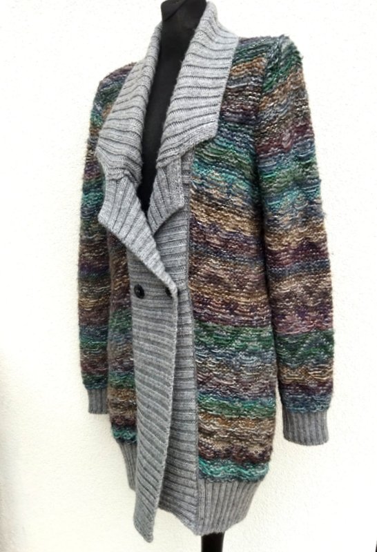 Wspaniały sweter z grubszej ale miękkiej włóczki w kolorach szarości, kilku odcieni zieleni, beżów, brązów i granatu z ciekawym przestrzennym wzorem. Dwurzędowy z kołnierzem z rewersami, zapinany na dwa guziki Wykończony szarymi ściągaczami