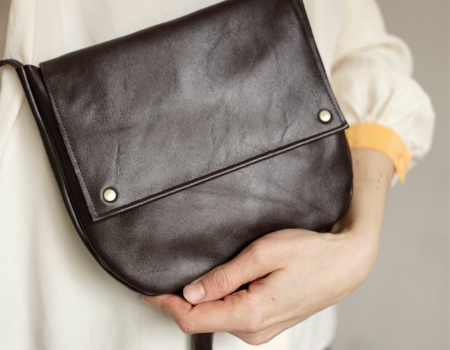 Mała minimalistyczna torebka na ramię. Wykonana z wysoko gatunkowej ciemno brązowej skóry. Bez podszewki, środek to lewa strona skóry, zamszowa. Torebka zamykana na dwa magnesy w kolorze starego złota.
