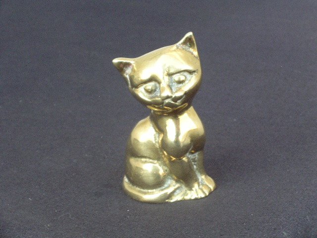 Mosiężny kotek, pełny odlew. Bardzo lubi światło, bo aż świeci :) Z charakterem. 4 x 4 x 7 cm. Stan zachowania mosiężnie bardzo dobry :)