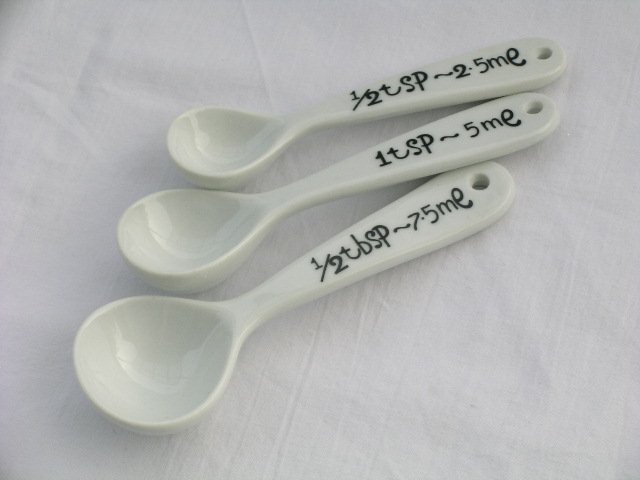 Porcelanowe łyżeczki - każda w innym rozmiarze i z odpowiadającą jej miarką podaną w łyżeczkach i mililitrach. Na zamówienie - wybrany objętościowy duet :) Fajny kształt, przyjemne wzornictwo. Z dziurkami do powieszenia. Błyszczące wykończenie. Aptekarska jakość grubszej porcelany. Długość 10,5 - 12 cm. Stan zachowania bardzo dobry.