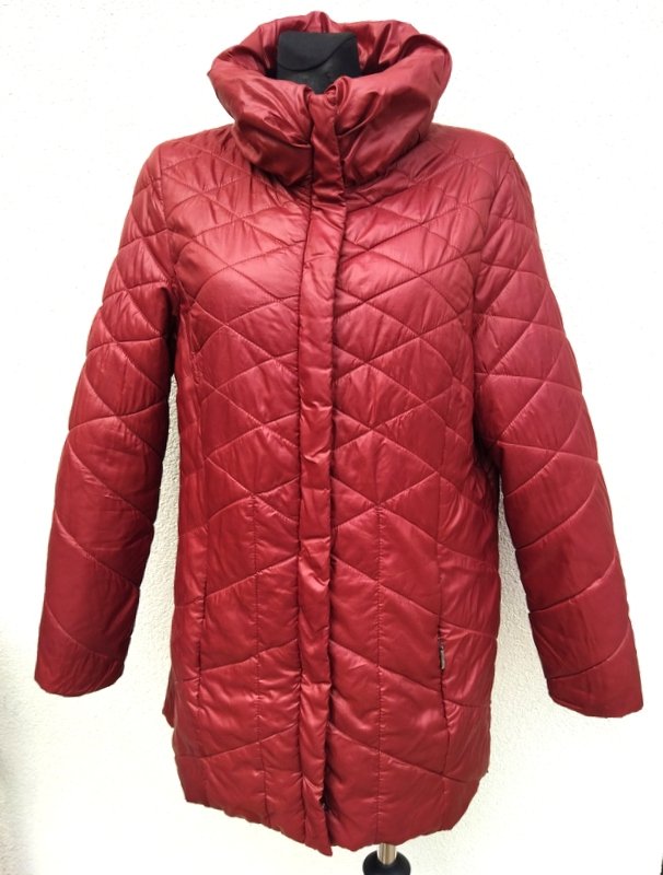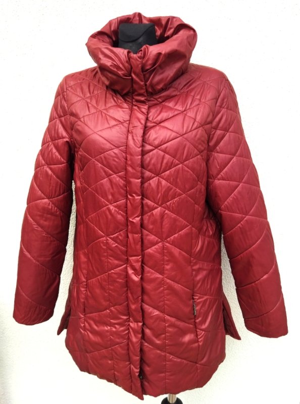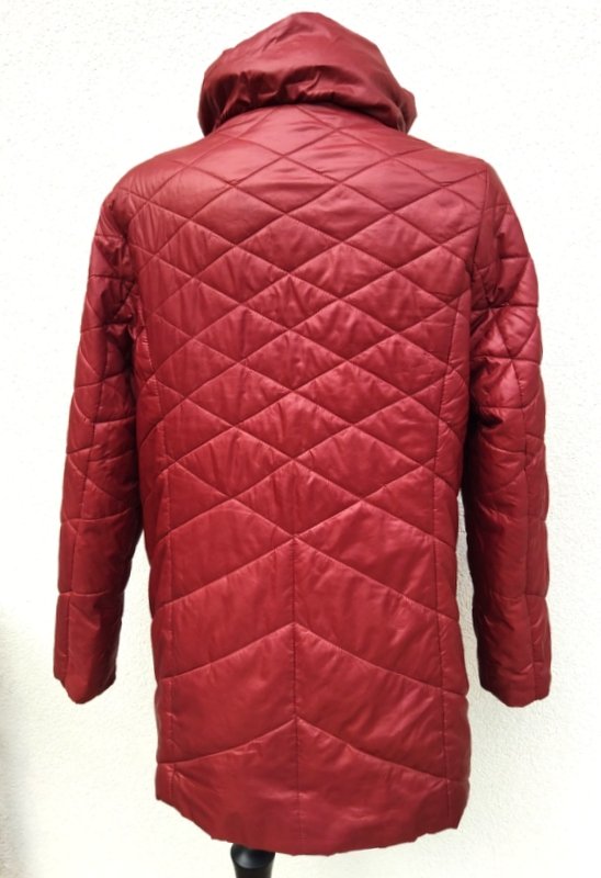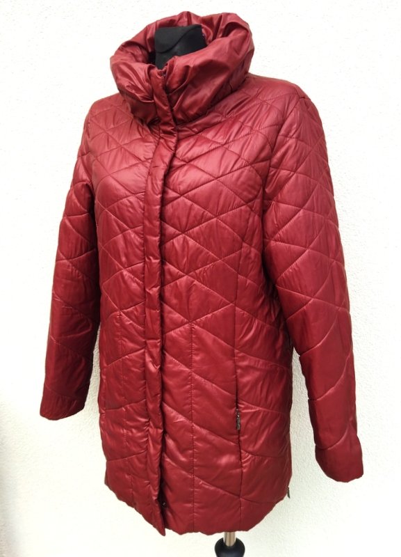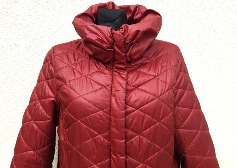Miła dłuższa ocieplana pikowana kurtka z poliestrowej tkaniny w burgundowym kolorze z domieszką brązu. Z puchatym kołnierzem typu wyższa stójka, z rozcięciami po bokach zapinanymi na zamki, z dwiema wpuszczanymi kieszeniami z zamkami. Zapinana na zamek ukryty pod plisą zapinana na napy. Całość na podszewce. Wygodna i bardzo lekka