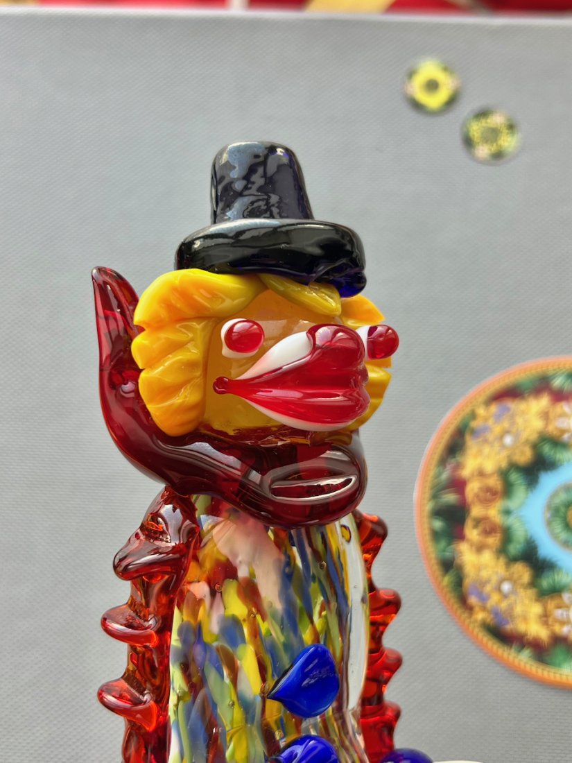 Wspaniała figura klauna marki murano, przedmiot dawniejszy. W całosci recznie wykonany, każdy element formowany ręcznie, szkło barwione w masie.