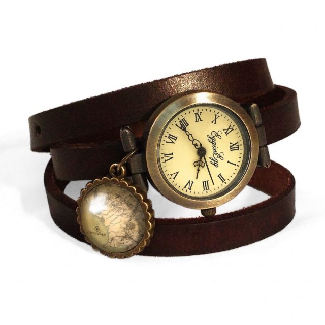 Zegarek ze skórzanym paskiem kilkakrotnie zakręcanym na ręku z ręcznie robioną zawieszką (kaboszonem).