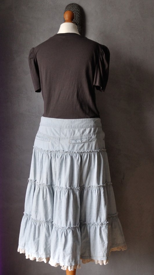Uszyta z niezbyt grubego, jasnobłękitnego jeansu o ciekawej fakturze "w kratkę".