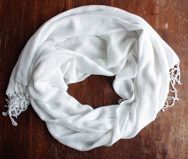 Niezwykle miękki, duży biały szal o pięknej fakturze. Materiał to prawdopodobnie bawełna.