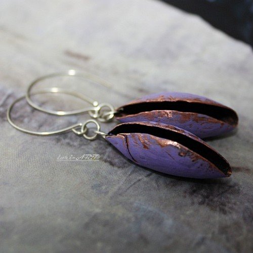 Intrygujące wyraziste kolczyki wykonane w całości ręcznie , nieco surowy organiczny styl ( nie są identyczne ) wykonane z kutej , formowanej miedzi ( muszle ) , reszta elementów ze srebra pr. 925 , muszle - wys. ok. - 3,4 cm , szer. ok. - 1,3 cm , malowane nieregularnie profesjonalnym , specjalistycznym woskiem w tonacji pastelowego fioletu , środek ciemno-szary , obrzeża przetarte dla podkreślenia surowości . Zabezpieczony odpowiednim medium przed wpływem czynników zewnętrznych . Biżuterie wysyłam w ozdobnym bezpiecznym opakowaniu .