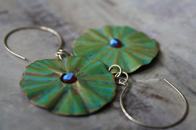 Intrygujące wyraziste kolczyki wykonane ręcznie , nieco surowy organiczny styl ( nie są identyczne ) wykonane z formowanej miedzi ( koła ) , opalizującego , szronionego , fasetowanego , rubinowego kwarcu , reszta elementów ze srebra pr. 925 , koła - śr. ok. - 3 cm , malowane nieregularnie profesjonalnym , specjalistycznym woskiem w tonacji oliwkowej zieleni i złota , ciut akwamaryny ( pięknie opalizują ) . Zabezpieczony odpowiednim medium przed wpływem czynników zewnętrznych . Biżuterie wysyłam w ozdobnym bezpiecznym opakowaniu .