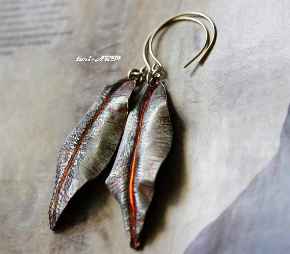 Intrygujące wyraziste kolczyki wykonane ręcznie , lekko surowy styl ( nie są identyczne ) wykonane z kutej , formowanej miedzi ( liście ) , reszta elementów ze srebra pr. 925 , liście - wys. ok. - 6 cm , szer.ok - 2,3 cm , patynowane profesjonalnym , specjalistycznym woskiem w tonacji bialo-czarno-srebrnym . Biżuterie wysyłam w ozdobnym bezpiecznym opakowaniu .