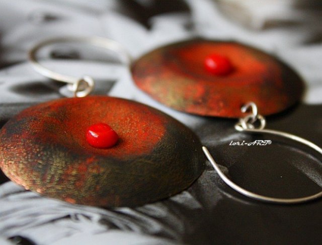 Intrygujące wyraziste kolczyki wykonane ręcznie , lekko surowy styl ( nie są identyczne ) wykonane z kutej , formowanej , repusowanej miedzi ( tarcze ) , czerwonego korala - śr. ok. - 6 mm , reszta elementów ze srebra pr. 925 , tarcze - śr. ok.- 3,7 cm , patynowane profesjonalnym , specjalistycznym woskiem w tonacji czarno-czerwono-złotym , rewers czarny . Zabezpieczony odpowiednim medium przed wpływem czynników zewnętrznych. Biżuterie wysyłam w ozdobnym bezpiecznym opakowaniu .