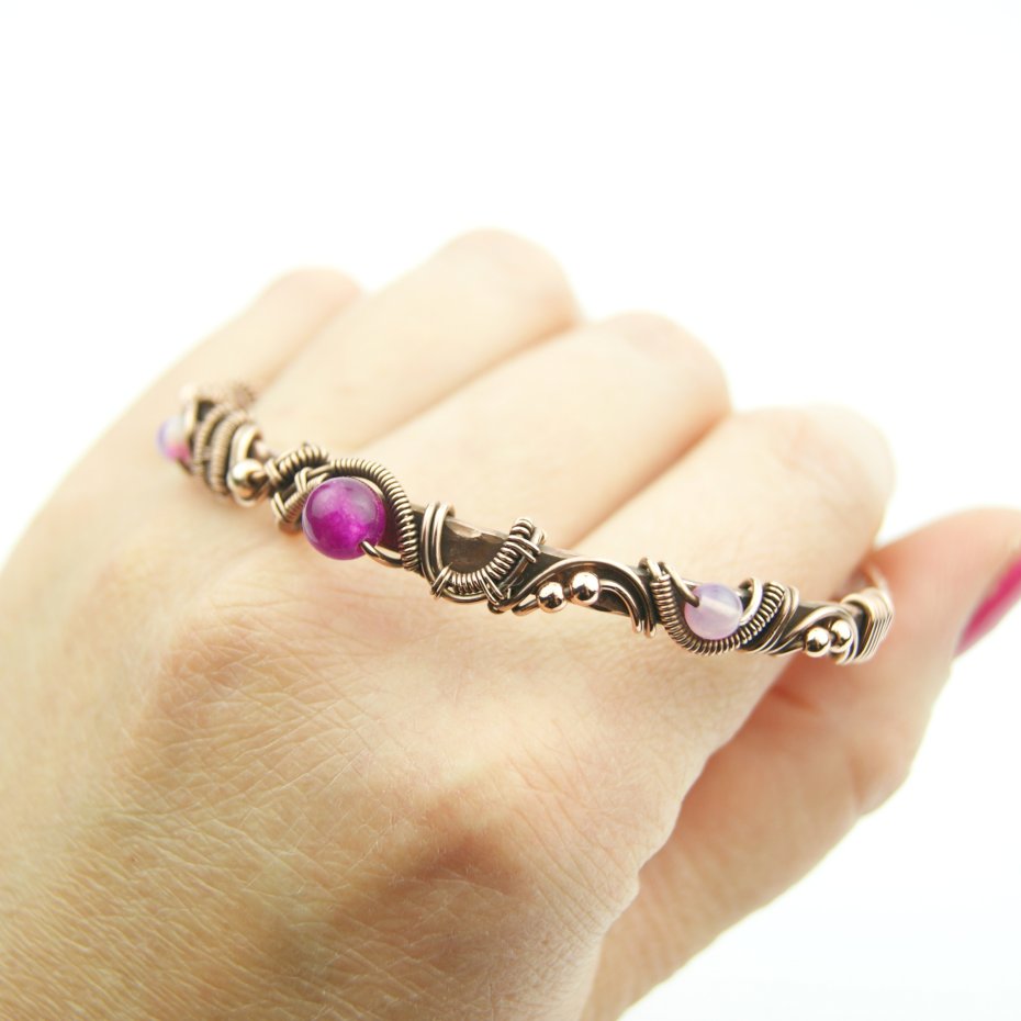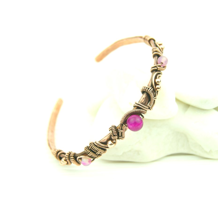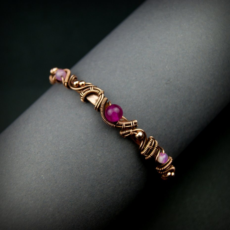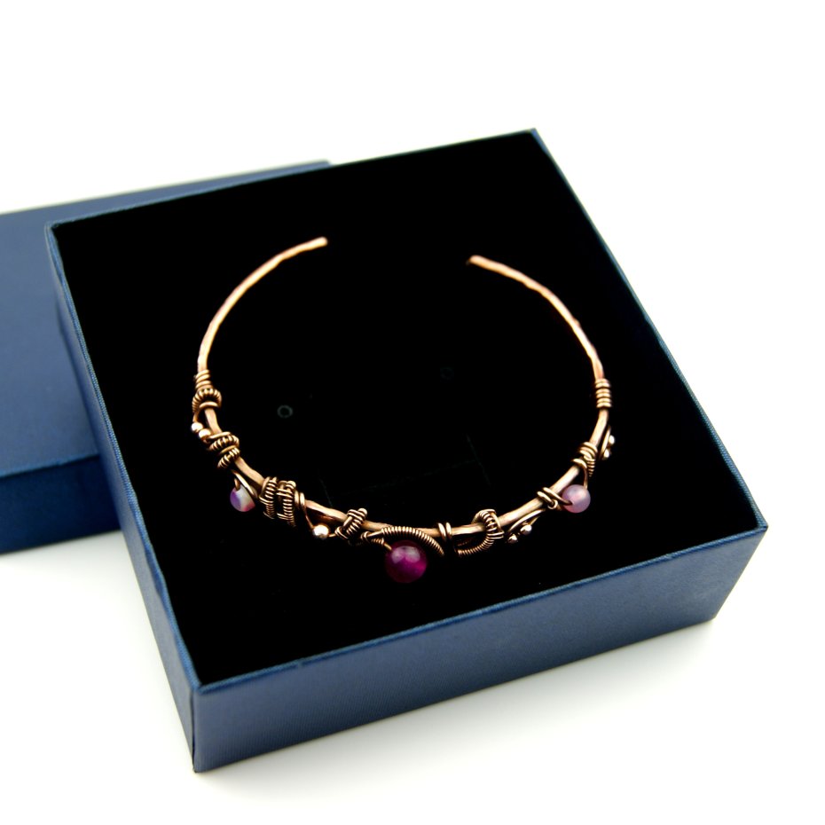 Bransoleta mankietowa (typu cuff) wykonana z fakturowanej miedzi, z misternym oplotem, w którym połyskują kamienie: różowe agaty i złote hematyty. Średnica bransolety wynosi 6 cm, obwód 18 cm.