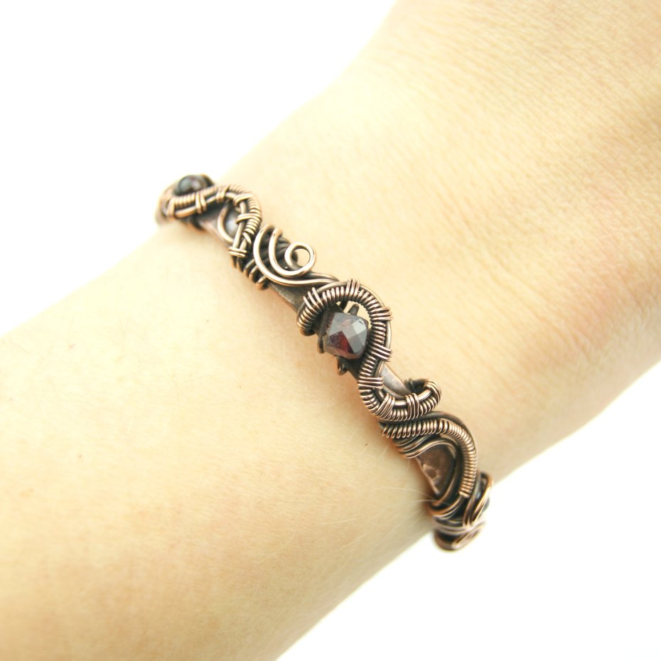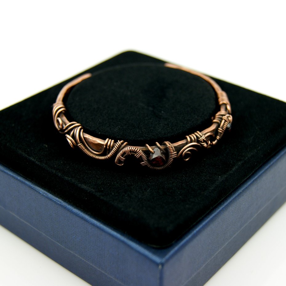 Bransoleta typu cuff wykonana z fakturowanej miedzi, z misternym oplotem, w którym połyskują kamienie granatu. Średnica bransolety wynosi 5 cm, obwód 15,5 cm. Bransoleta raczej na wąski nadgarstek.