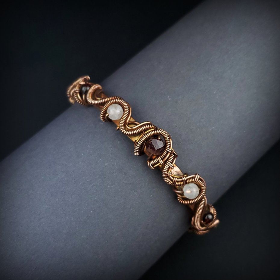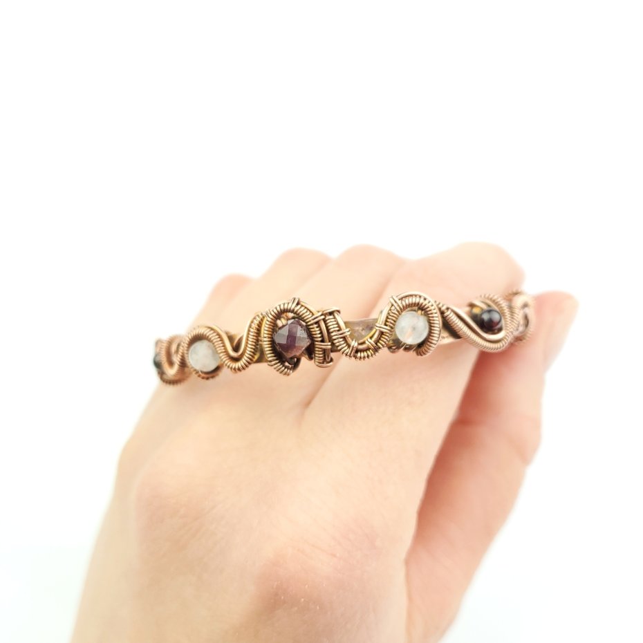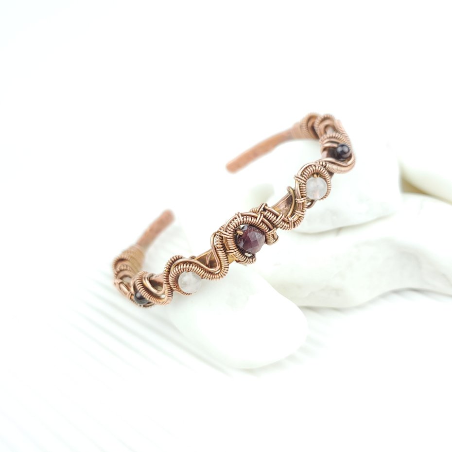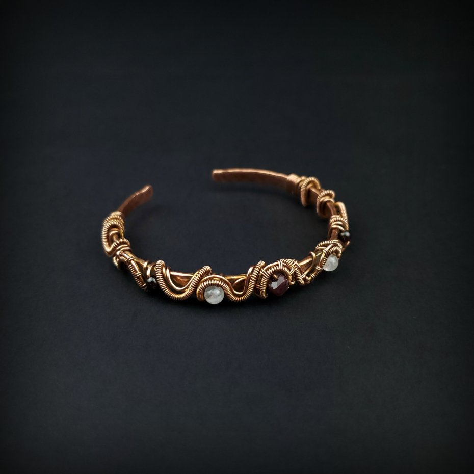 Bransoleta typu cuff wykonana z fakturowanej miedzi, z misternym oplotem, w którym połyskują kamienie granatu. Średnica bransolety wynosi 6 cm, obwód 17,5 cm.