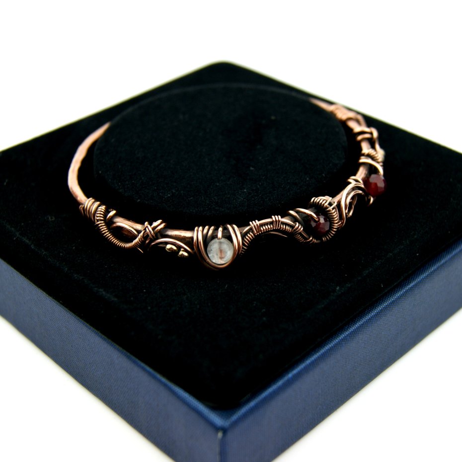 Bransoleta mankietowa (typu cuff) wykonana z fakturowanej miedzi, z misternym oplotem, w którym połyskują kamienie: rubin, różowy kwarc i złote hematyty. Średnica bransolety wynosi 5,5 cm, obwód 17,2 cm.