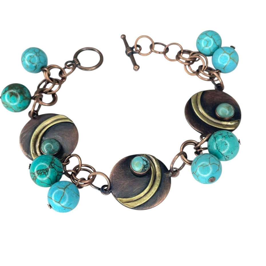 Ręcznie tworzona bransoletka utrzymana w ciepłych odcieniach patynowanej miedzi została wzbogacona naturalnymi kamieniami w turkusowej palecie barw. Okrągłe howlity i afrykańskie turkusy wprowadzają intensywny, świeży akcent kolorystyczny, który efektownie kontrastuje z metaliczną bazą. Centralną część kompozycji tworzą oksydowane miedziane medaliony, uzupełnione mosiężnymi elementami o łagodnych, geometrycznych kształtach. Przemyślane rozmieszczenie kamieni sprawia, że bransoletka naturalnie układa się na nadgarstku, zachowując przy tym zdecydowany, artystyczny wyraz. To propozycja dla osób ceniących biżuterię inspirowaną naturą i autorskim rzemiosłem - doskonała zarówno na co dzień, jak i jako charakterystyczny akcent w stylizacjach boho lub z etniczną nutą.