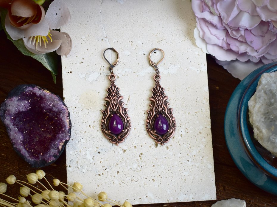 Kolczyki miedziane z fioletowym jadeitem to unikalna biżuteria w stylu wiktoriańskim i gotyckim. Wykonane metodą elektroformowania, charakteryzują się delikatnymi detalami, które nadają im wyjątkowy charakter. Fioletowy jadeit w połączeniu z miedzianą oprawą tworzy elegancki kontrast, idealny na specjalne okazje. To doskonały wybór na prezent dla miłośników biżuterii w vintage i gotyckim stylu. Kolczyki są lekkie, trwałe i stanowią piękny dodatek do każdej stylizacji, zarówno na co dzień, jak i na wyjątkowe wydarzenia.