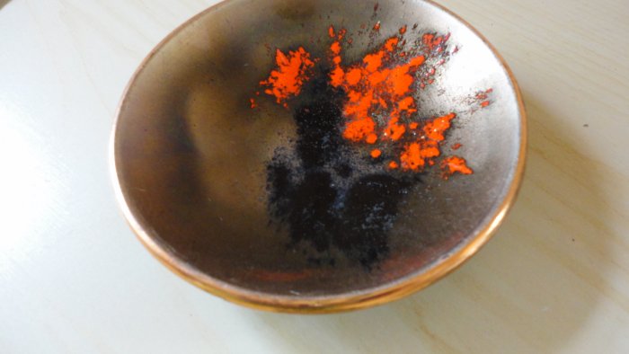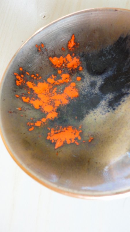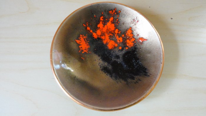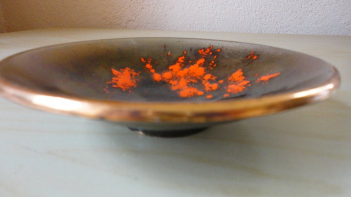 Wyjątkowo ładny talerzyk miedziany szkliwiony na ciepły, czekoladowy brąz z kroplami żywego pomarańczu wpadającego w czerwień oraz kleksami czerni, brzeg czysto miedziany. Urokliwy kształt - rant wywinięty, talerzyk - paterka na stopce. Nietuzinkowy i ozdobny.
