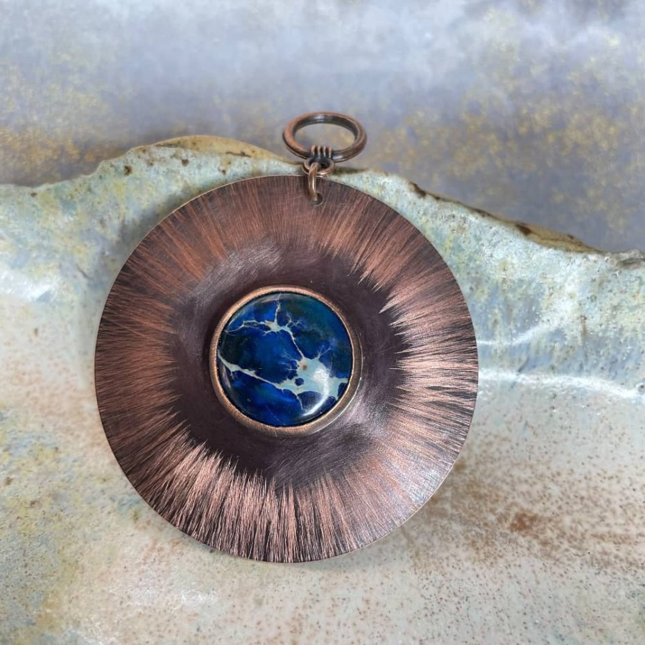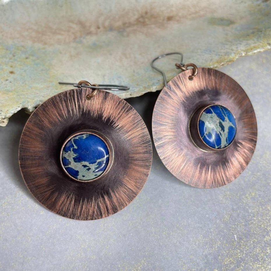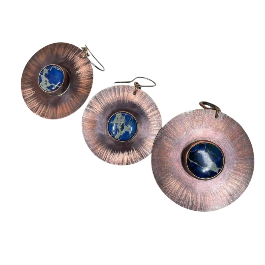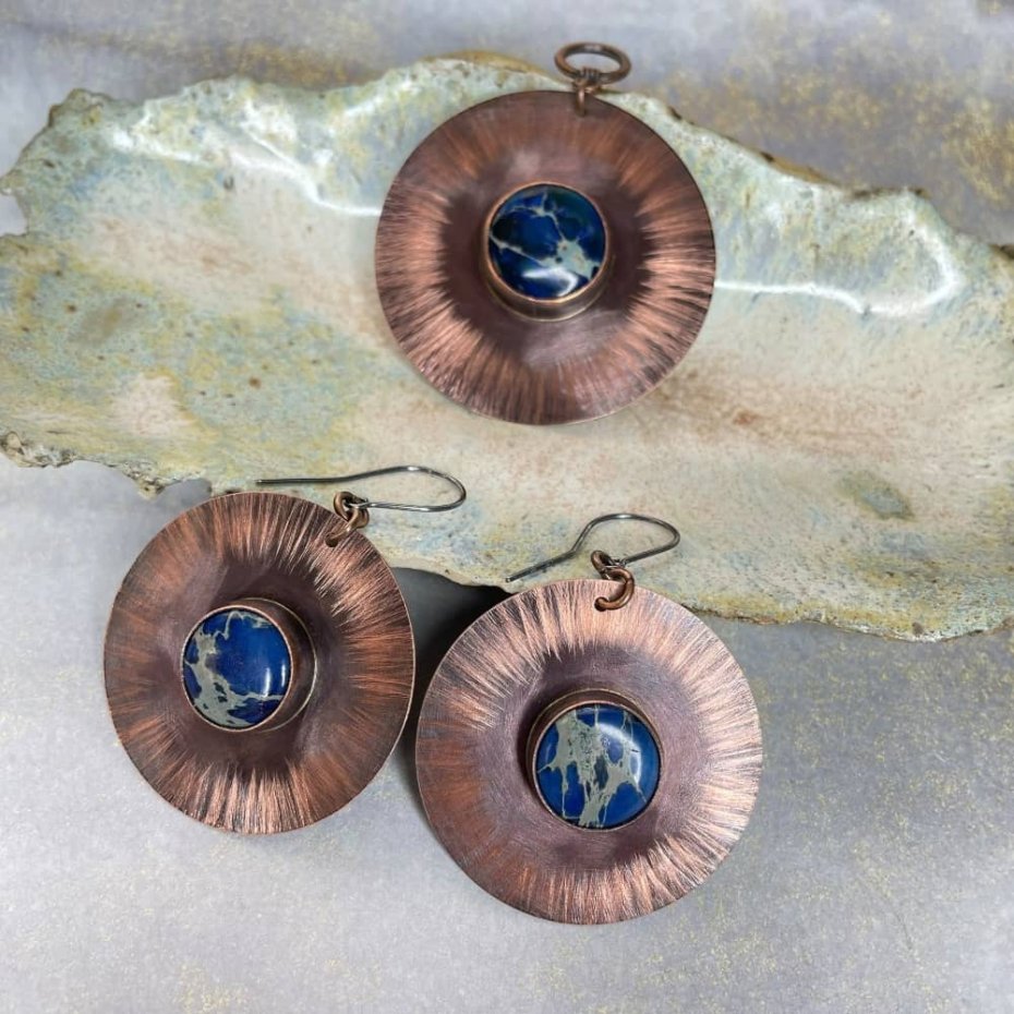 Komplet biżuterii z miedzianymi kołami i jaspisem cesarskim to idealny wybór dla miłośniczek charakterystycznego ciepła miedzi. Czerniona i fakturowana miedź podkreśla charakter dodatków, a intensywny kolor kamieni pięknie kontrastuje z metalicznym blaskiem. Bigle wykonano z czernionego srebra próby 925, co dodaje całości elegancji.
