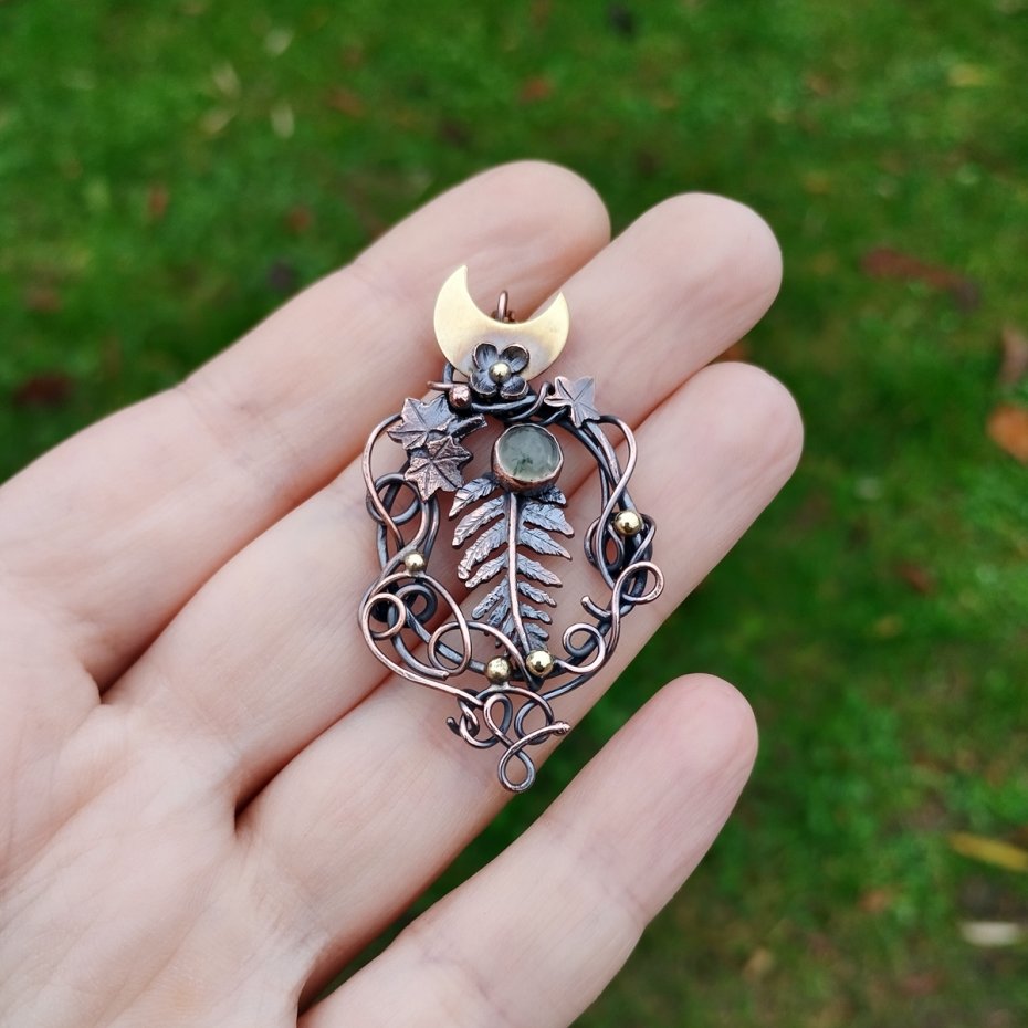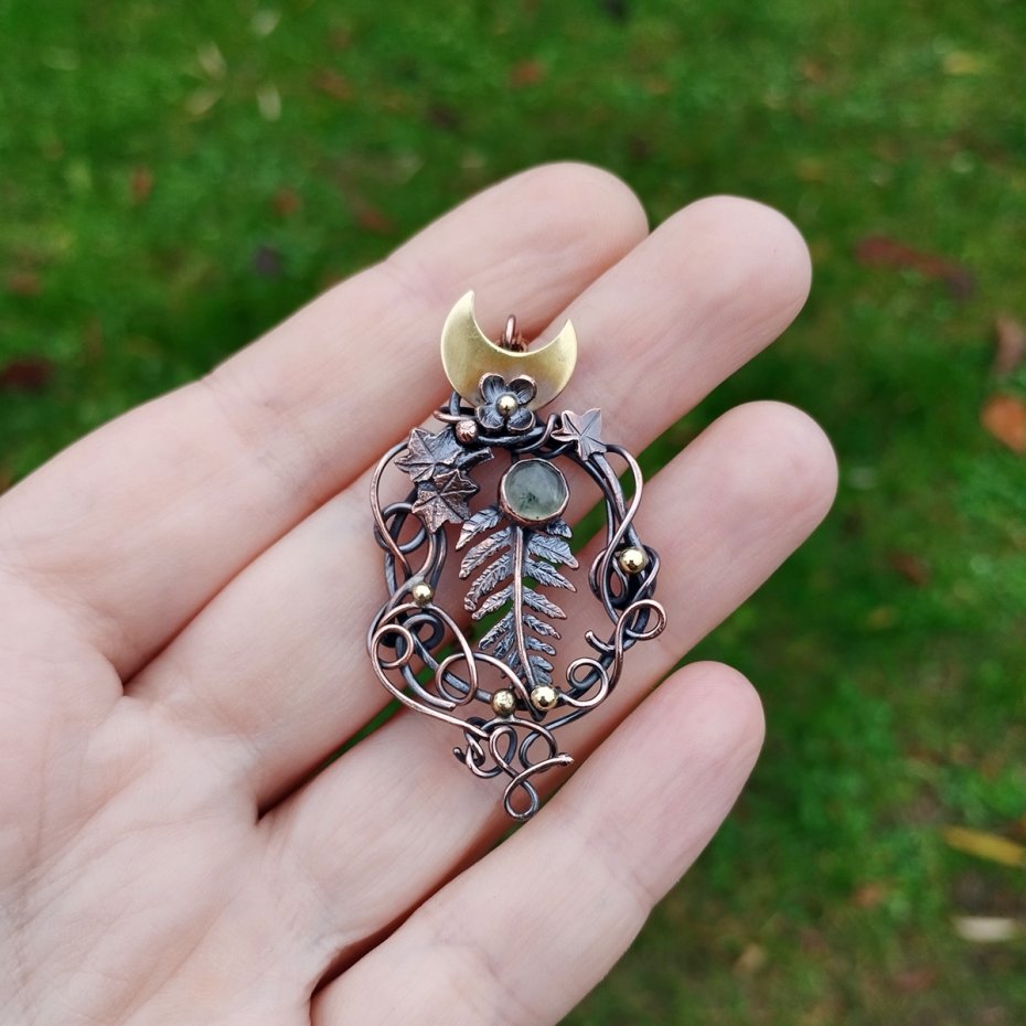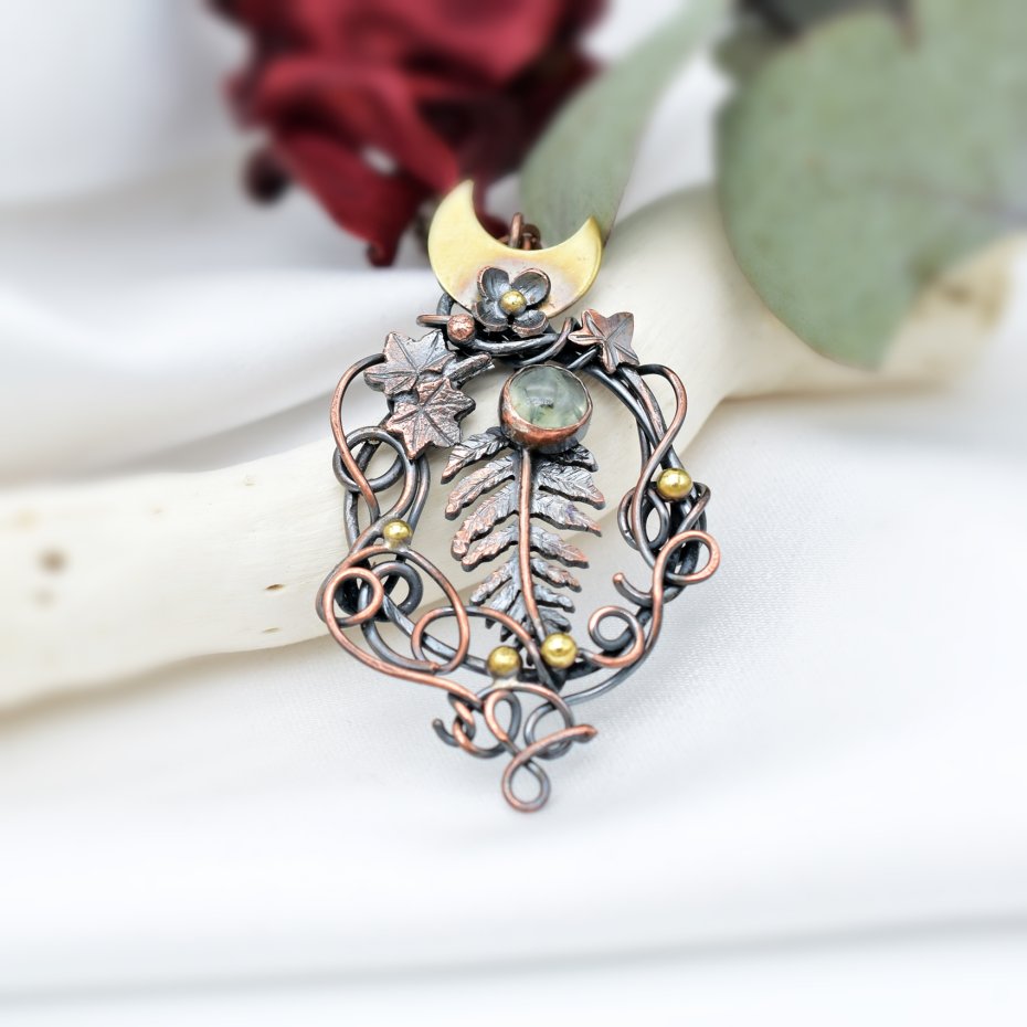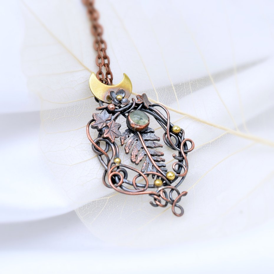 Oryginalny, ręcznie wykonany naszyjnik w ciepłej tonacji miedzi i mosiądzu, z subtelną zielenią prehnitu. Wisiorek łączy motyw paproci z połyskującym, złocistym półksiężycem, ozdobiony jest roślinnymi detalami i miedzianymi splotami. Naturalne barwy i artystyczny charakter tworzą wyjątkowy dodatek dla miłośniczek leśnych klimatów.