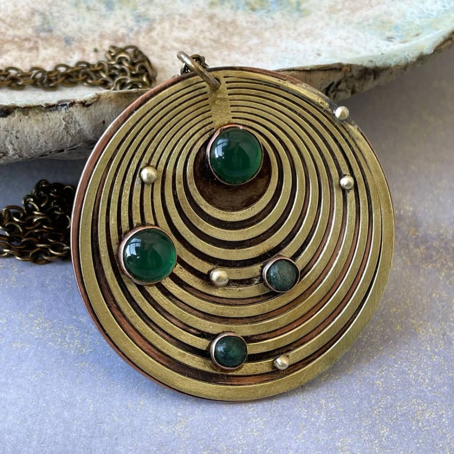 Zielono na orbitach to elegancki naszyjnik, który łączy minimalistyczną formę z retro estetyką. Mosiężne okręgi umieszczone na miedzianej podstawie przypominają orbity planet, po których krążą zielone kamienie - agat i awenturyn. Czerniona i przecierana powierzchnia dodaje kontrastu między brązem miedzi a złotym blaskiem mosiądzu. Ta prosta, a jednocześnie wyrazista kompozycja przyciąga uwagę swoją nietuzinkową formą.