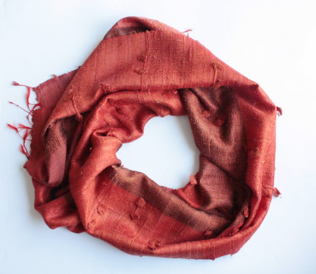 Dlugi, miękki szal w miedzianym kolorze o ciekawej, niejednolitej, surowej strukturze.
