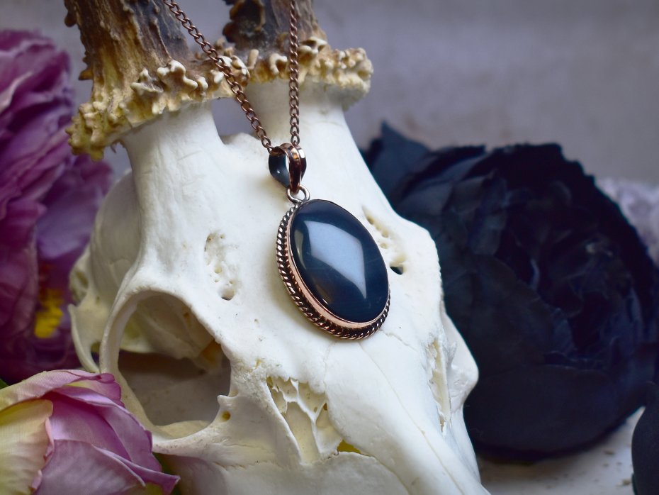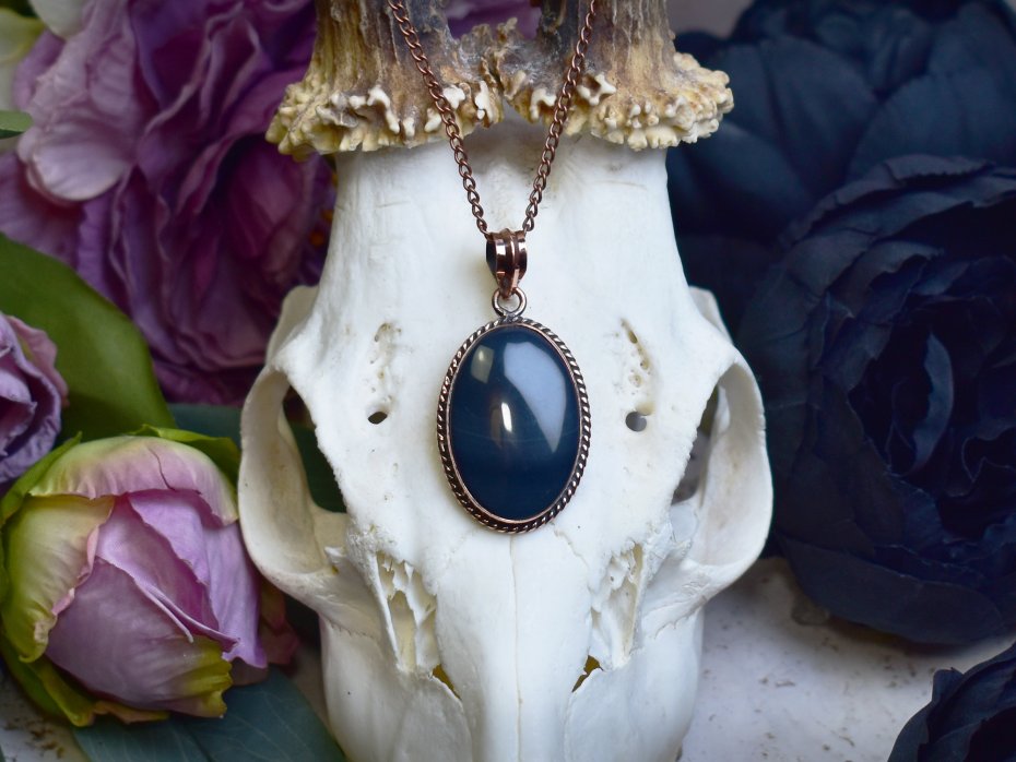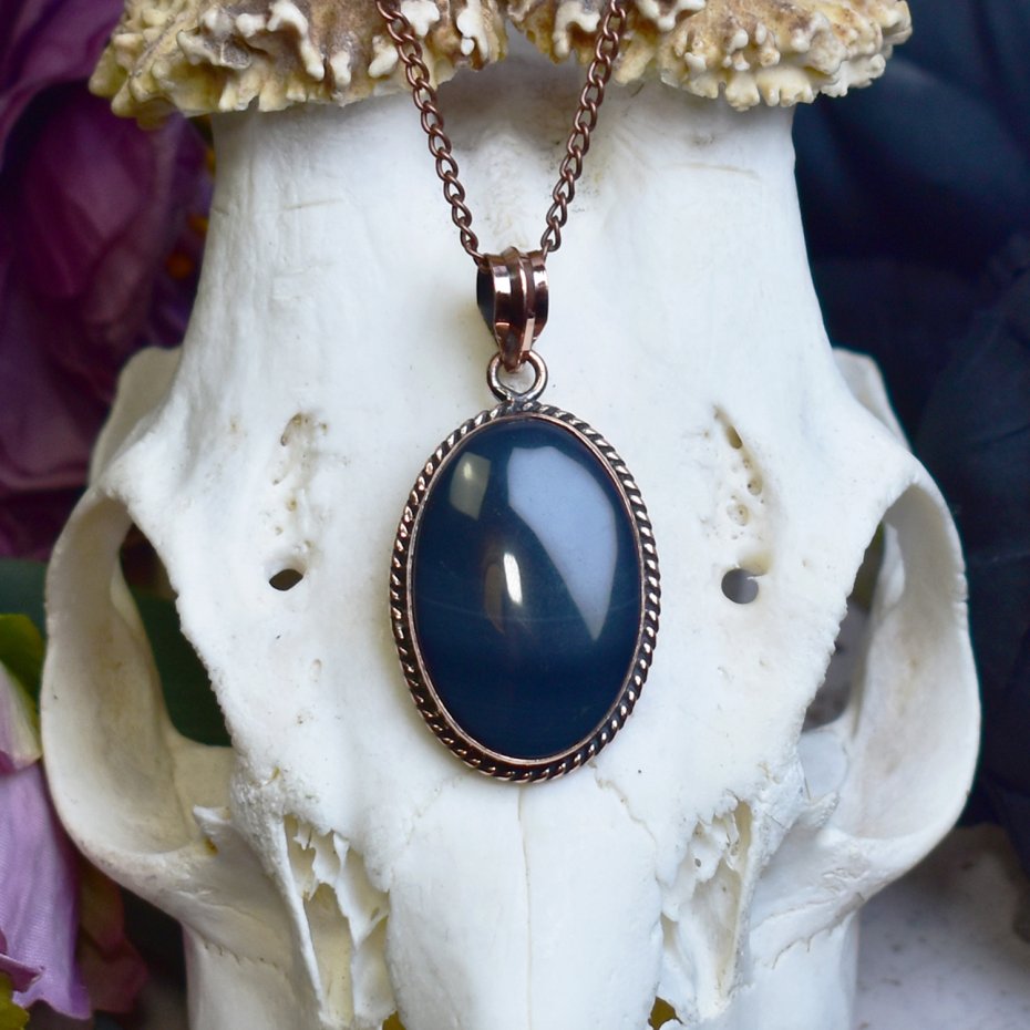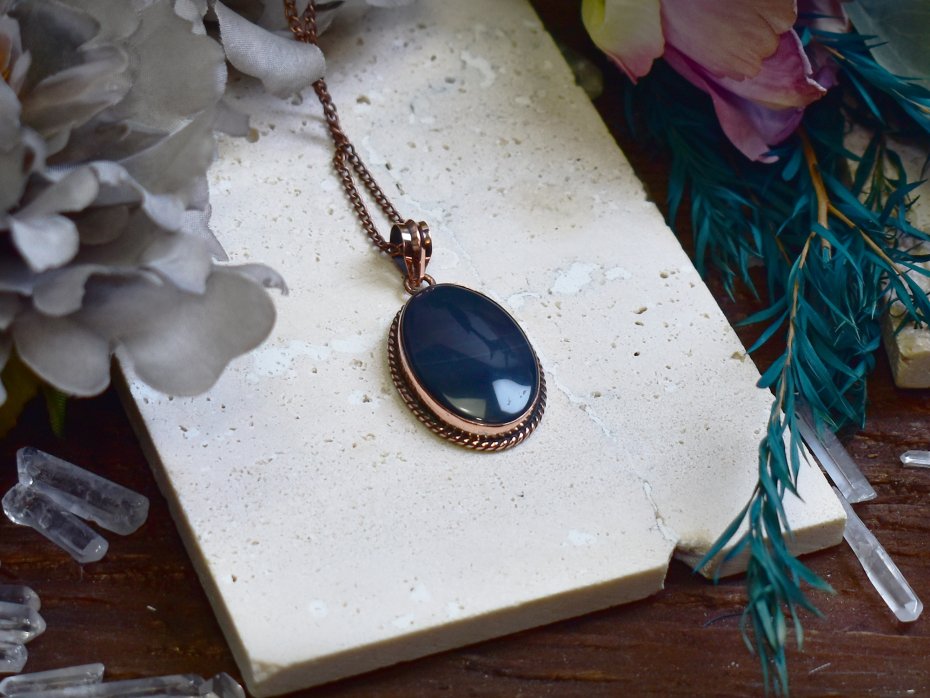 Miedziany wisiorek wykonany tradycyjnymi metodami rzemieślniczymi, ozdobiony czarnym agatem Botswana – kamieniem o intensywnym, głębokim odcieniu czerni z charakterystycznymi, delikatnymi pasami i wzorami. Agat Botswana uznawany jest za kamień ochronny, sprzyjający wyciszeniu umysłu, harmonii emocjonalnej oraz zwiększeniu wewnętrznej siły i odwagi. Kontrast ciemnego kamienia z ciepłym odcieniem miedzi tworzy elegancką i wyrazistą kompozycję, podkreślającą naturalne piękno minerału. Wisiorek łączy klasyczną formę z surowym charakterem kamienia, nadając biżuterii ponadczasowy i subtelnie mistyczny wyraz. To wyjątkowa propozycja dla osób ceniących rękodzieło, unikatowe minerały i biżuterię o symbolicznym znaczeniu.