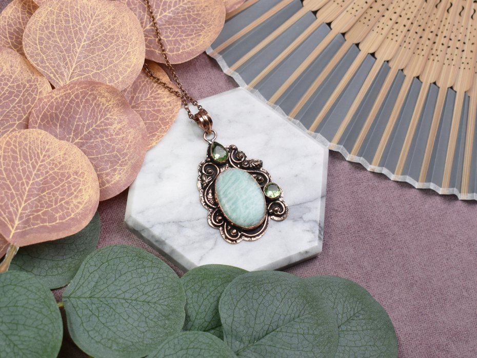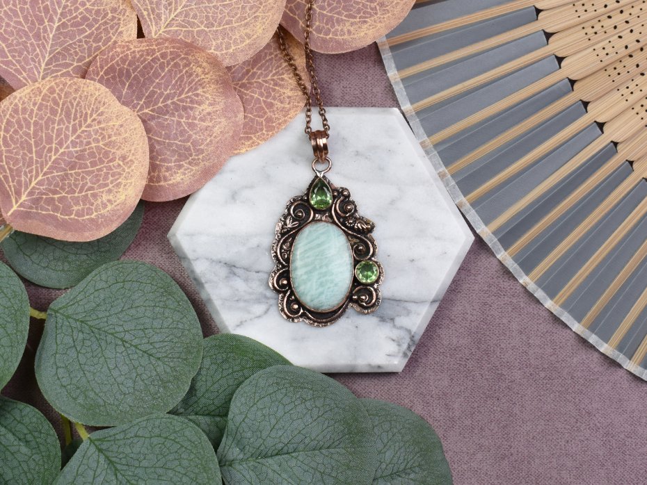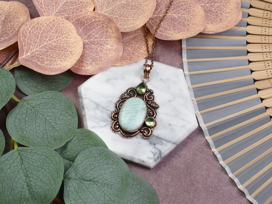Ten elegancki wisiorek to kwintesencja uroku i naturalnej piękności. Wykonany z ozdobnej miedzi, zdobią go kamienie - amazonit i peridot. Amazonit znany jest ze swoich właściwości harmonizujących, przynoszących spokój, podczas gdy peridot to kamień obfitości, przyciągający pozytywną energię i radość życia. Nosząc ten wisiorek, otaczasz się nie tylko estetyką, ale także korzystasz z dobroczynnych właściwości tych pięknych kamieni.