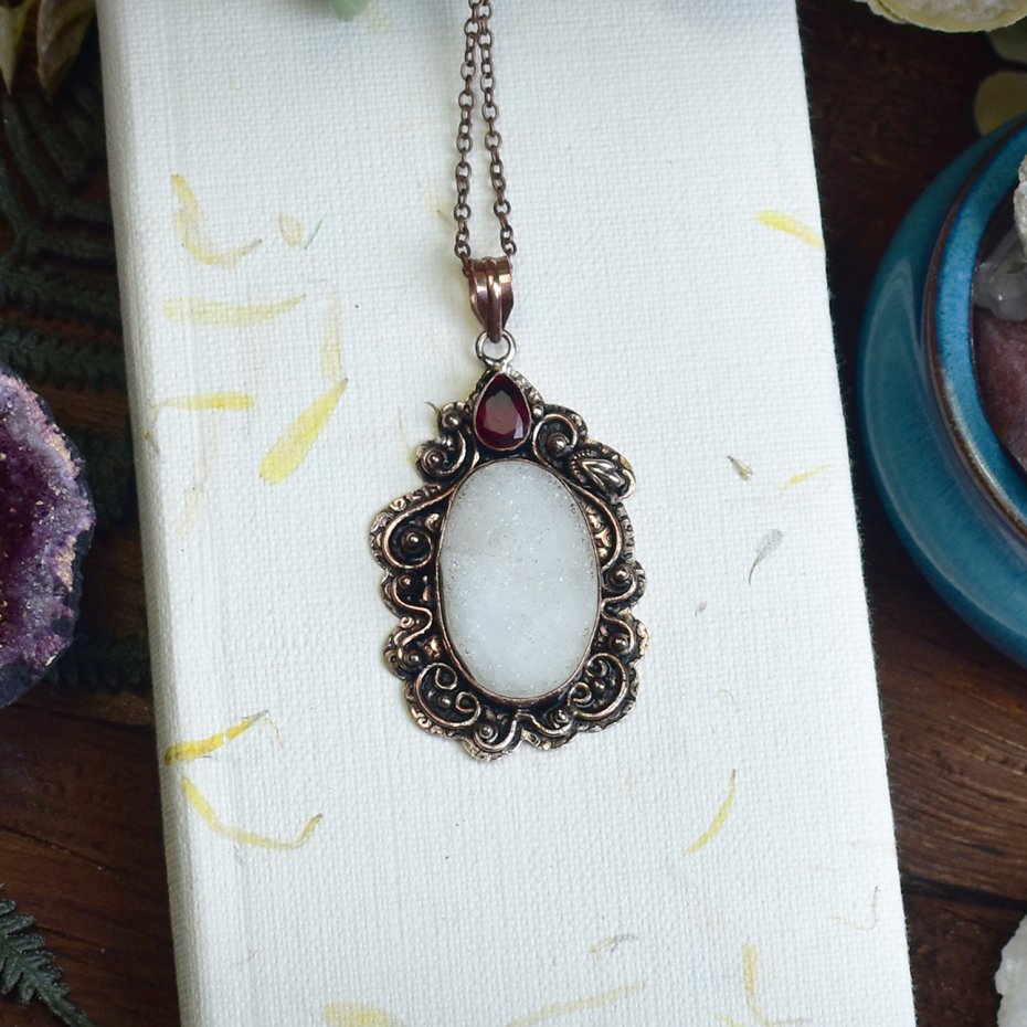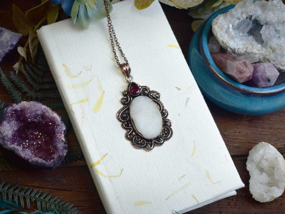Poza tym zajmuję się oprawą kamieni. Używam kamieni naturalnych, kocham labradoryty, ametysty i kwarce. Do oprawy używam miedzi i cyny w technice tiffany oraz miedzi do elektroformowania. Inspiruję się naturą chcąc stworzyć wisiorki i amulety wyglądające jak z gier fantasy :)