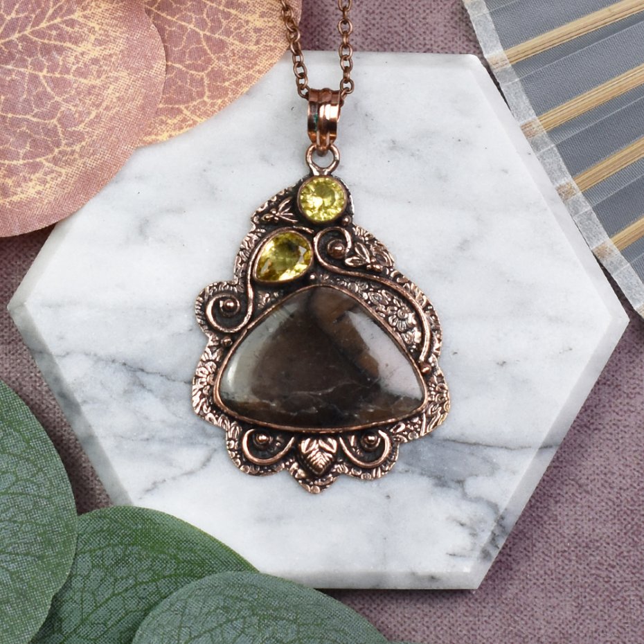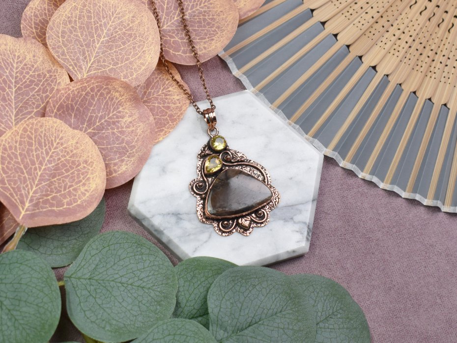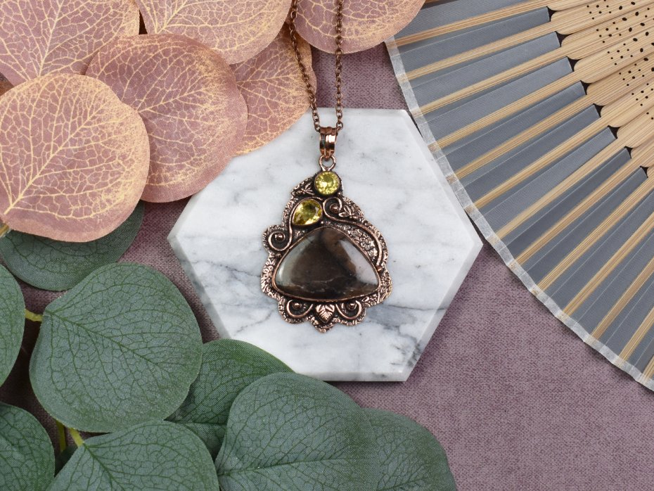 Elegancki wisiorek z miedzi, jaspisem i cytrynem to niezwykła biżuteria, która łączy w sobie estetykę i pozytywną energię. Jaspis, znany ze swoich właściwości stabilizujących, dodaje wisiorkowi ziemiennego piękna, podczas gdy cytryn wzbogaca go o promienne światło i radość. Nosząc ten wyjątkowy wisiorek, nie tylko podkreślisz swoją indywidualność, ale także zyskasz wsparcie kamieni, które tradycyjnie przypisuje się zwiększeniu siły witalnej, spokoju i optymizmu.
