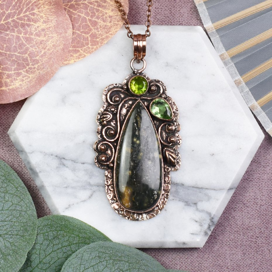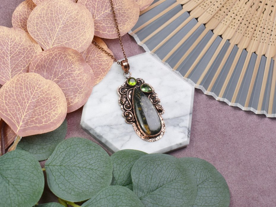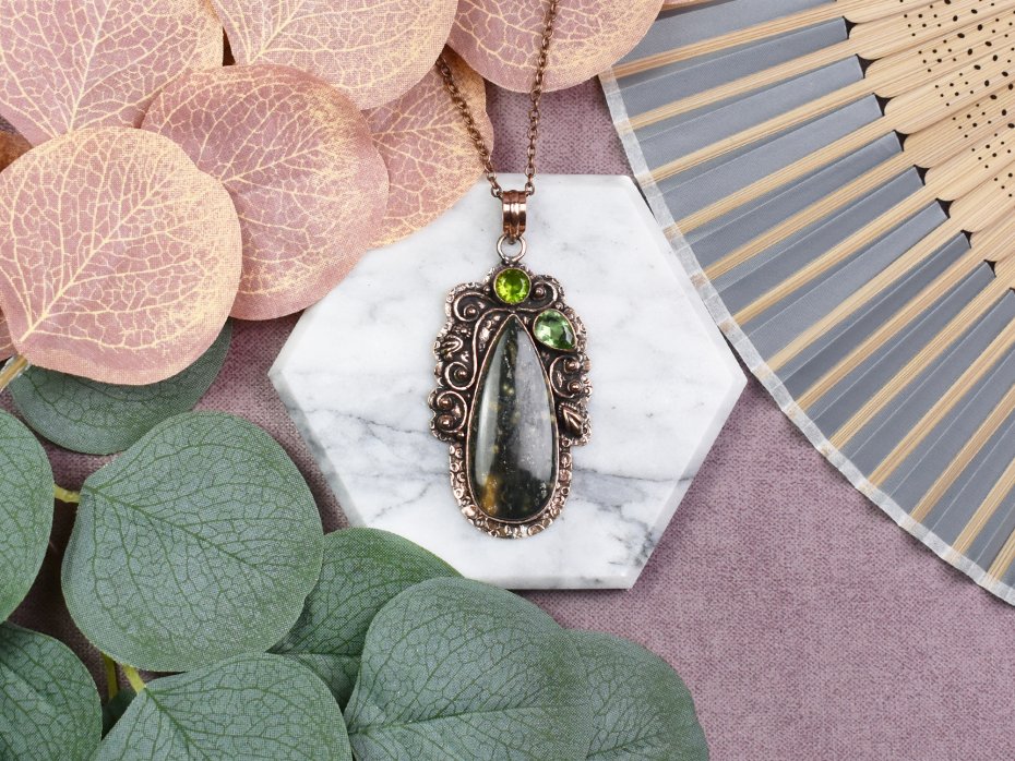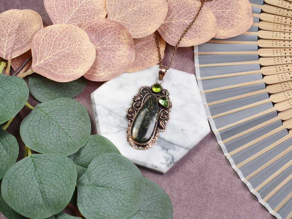 Elegancki wisiorek z miedzi ozdobiony jaspisem oceanicznym i peridotem to wyjątkowy dodatek do każdej stylizacji. Jaspis oceaniczny, znany ze swojej energetyzującej morskiej esencji, dodaje wisiorkowi spokoju i harmonii. Peridot natomiast przynosi prosperity i ożywia zmysły, tworząc połączenie kamieni, które nie tylko zachwycają swoim wyglądem, ale także przynoszą pozytywne wibracje.