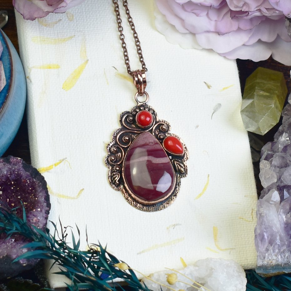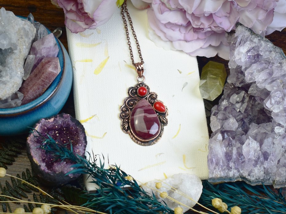 Ręcznie wykonany miedziany wisiorek ozdobiony mokaitem i koralem. Mokait to kamień kojarzony z siłą, witalnością i wewnętrzną harmonią, a koral symbolizuje ochronę i energię życia. Tradycyjna technika tworzenia biżuterii podkreśla unikalny charakter minerałów. Ten wyjątkowy amulet łączy w sobie naturalne piękno i rzemieślniczą precyzję.