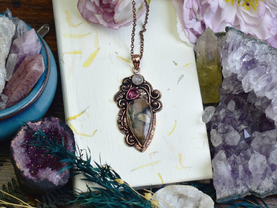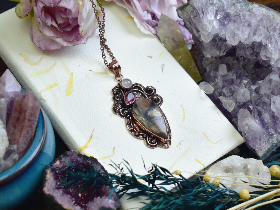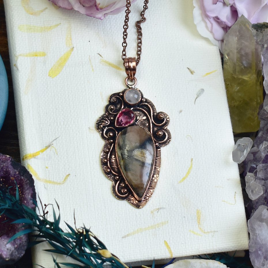 Ozdobny miedziany wisiorek wykonany tradycyjnymi technikami, zdobiony jaspisem, syntetycznym różowym topazem i różowym kwarcem. Jaspis od dawna kojarzony jest z siłą i stabilnością, różowy topaz symbolizuje miłość i pozytywną energię, a różowy kwarc sprzyja harmonii i wewnętrznemu spokojowi. Połączenie tych kamieni tworzy unikalną kompozycję o głębokiej symbolice. Wisiorek to nie tylko efektowna biżuteria, ale również amulet dodający pewności siebie i równowagi.