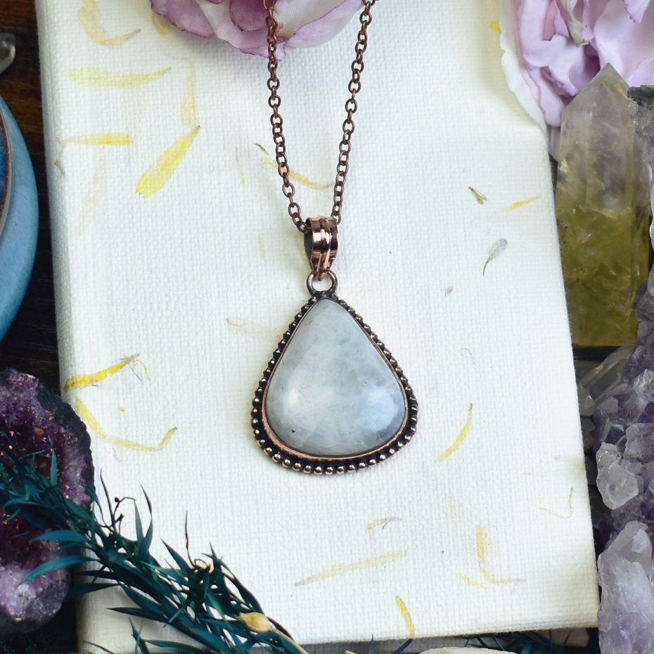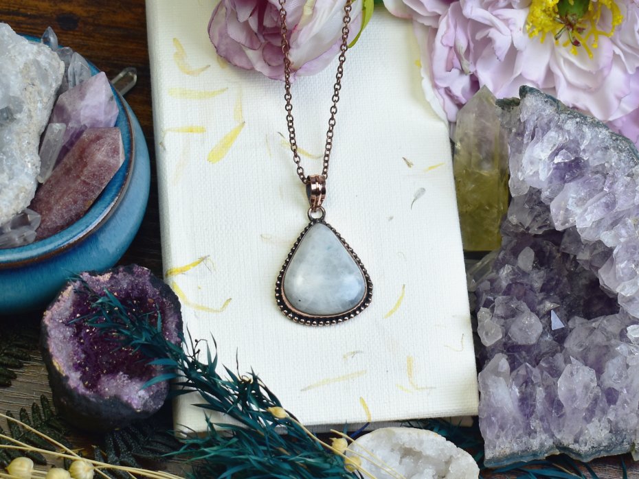 Ozdobny wisiorek z kamieniem księżycowym, wykonany tradycyjnymi metodami. Połączenie rzemiosła artystycznego z naturalnym pięknem minerału. Kamień księżycowy od wieków kojarzony jest z intuicją, harmonią i wewnętrznym spokojem. Delikatna oprawa podkreśla subtelny blask kamienia, tworząc unikalną ozdobę o mistycznym charakterze.