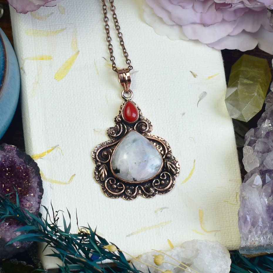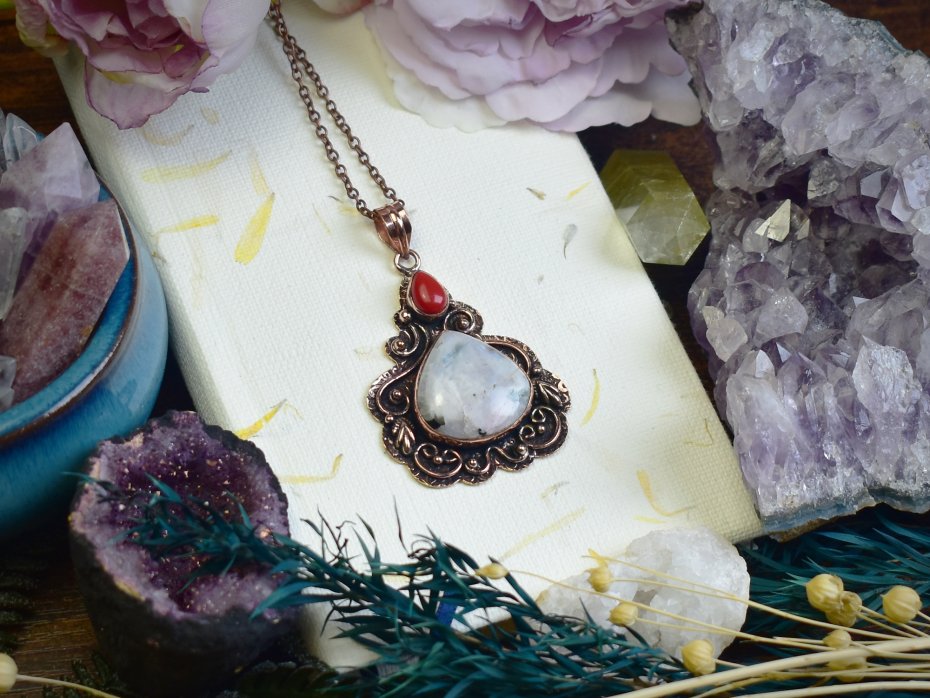 Miedziany wisiorek z kamieniem księżycowym i koralem to unikalna biżuteria wykonana tradycyjnymi technikami jubilerskimi. Kamień księżycowy, symbolizujący intuicję i wewnętrzną mądrość, w połączeniu z czerwonym koralem, który od wieków uznawany jest za talizman ochrony, tworzy harmonijną kompozycję. Całość oprawiona w miedź, co nadaje wisiorkowi ciepła i elegancji. Idealny dla osób poszukujących biżuterii o głębokim znaczeniu, łączącej naturalne piękno kamieni z ręcznym rzemiosłem.