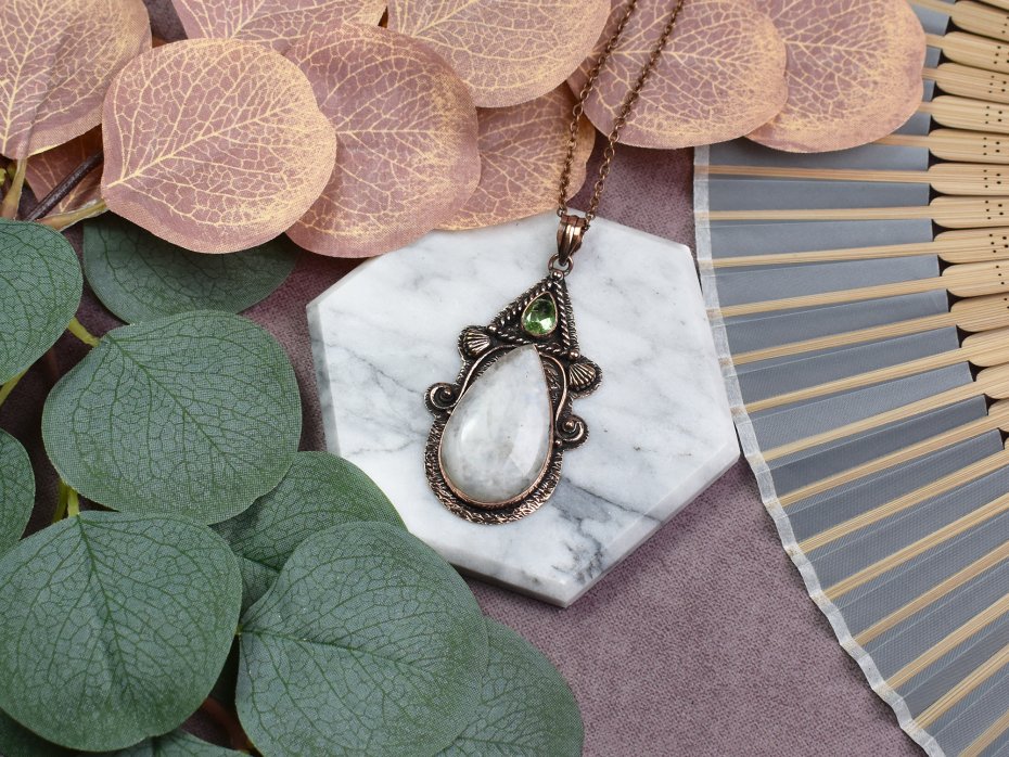 Elegancki wisiorek z miedzi ozdobiony kamieniem księżycowym i peridotem to subtelna biżuteria emanująca wyjątkowym urokiem. Kamień księżycowy, znany ze swojego delikatnego blasku, przynosi spokój i harmonię, podczas gdy peridot dodaje energii i optymizmu. To nie tylko wyjątkowy dodatek, ale również talizman łączący estetykę z pozytywną energią kamieni naturalnych.